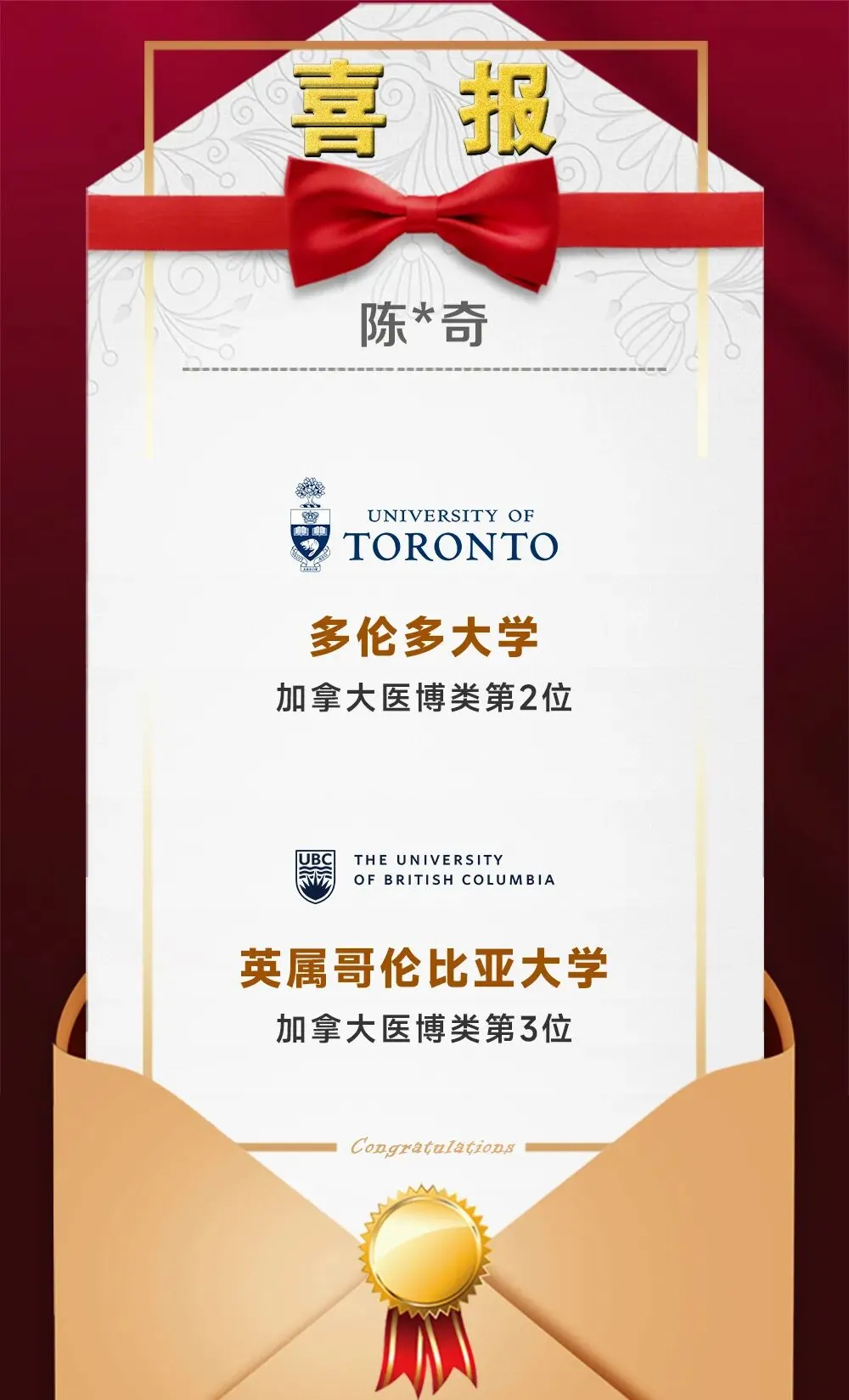 陈*奇、杨*平、孟*如、邵*依四位同学凭借卓越的学术实力与综合素养,斩获 多伦多大学 录取。另外,陈*奇同学更是一举摘得 英属哥伦比亚大学 的橄榄枝,孟*如获得 麦克马斯特大学 录取,为我校2026届海外升学再谱华章。