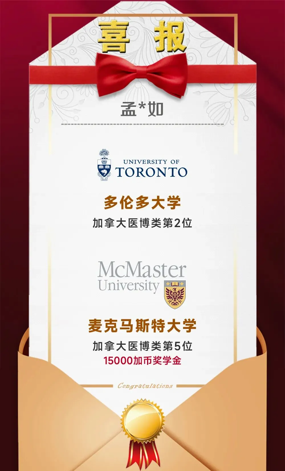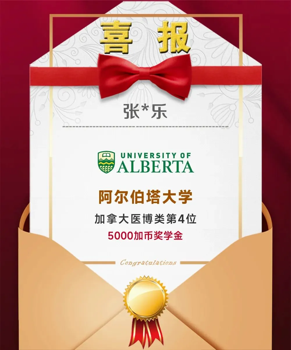 与此同时,张*乐和张*鑫两位同学双双收到 阿尔伯塔大学 的录取通知,并凭借出色表现分别荣获5000加币和3000加币的入学奖学金,充分展现了我校学子在国际舞台上的竞争力与风采。