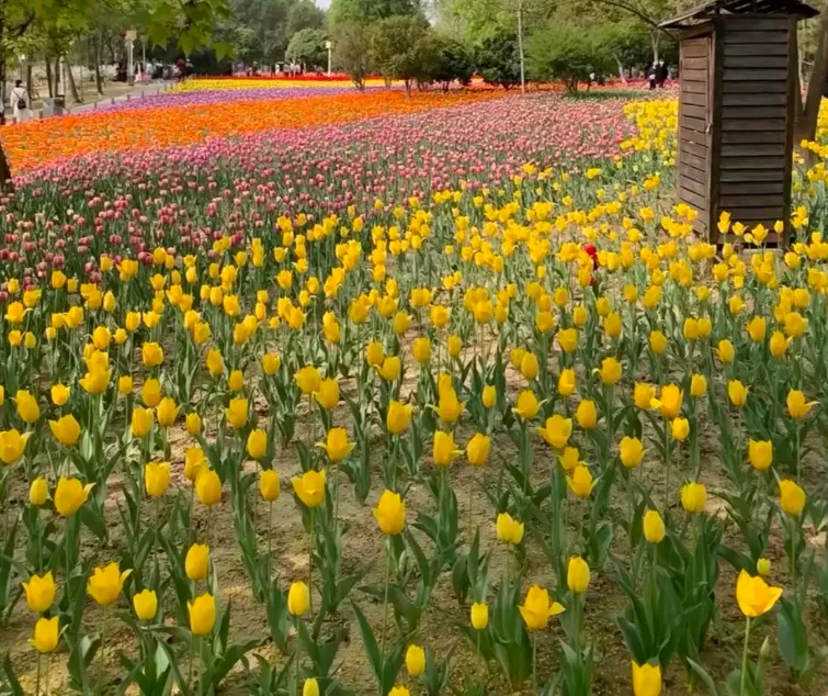 入园先被扑面而来的色彩撞个满怀!百万株郁金香铺成彩虹花田,粉的娇嫩、红的热烈、黄的明媚;同期绽放的碧桃如烟似霞,海棠垂丝摇曳,樱花落英缤纷,美人梅与玉兰早已抢先报春。
