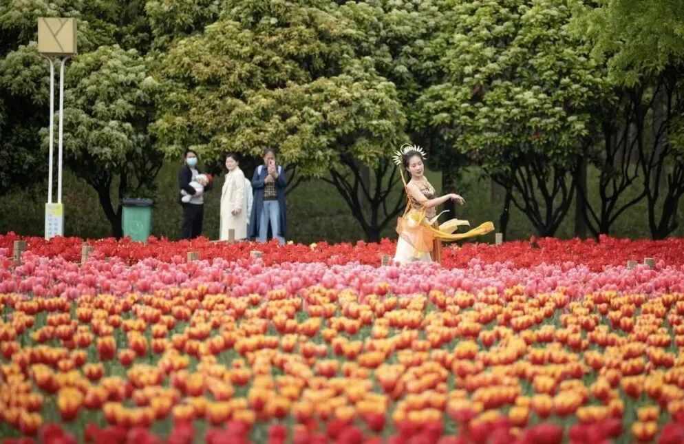 花海市集 & 花神巡游:古风市集藏在郁金香花海里,手作文创、轻食茶饮一应俱全。十二花神身着华服巡游,花仙演艺搭配花田乐队驻唱,仿佛穿越回千年花朝盛景。