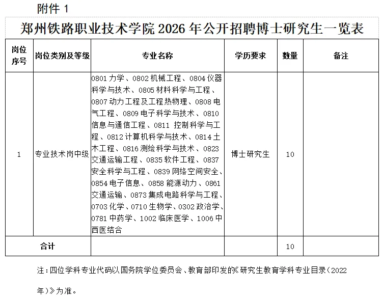 详见附件《郑州铁路职业技术学院2026年公开招聘博士研究生一览表》。