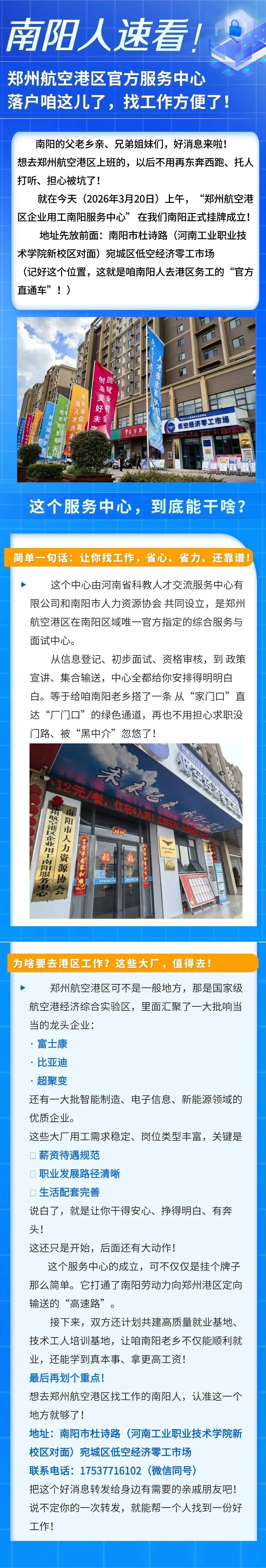 >南阳人速看!郑州航空港区官方服务中心落户咱这儿了,找工作方便了!