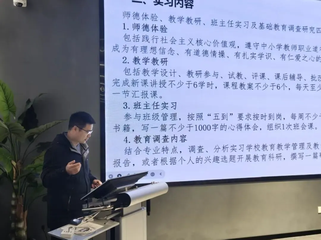 丁东奎对本次教育实习的整体安排、工作要求及保障措施进行了详细说明,明确了师德体验、教学教研、班主任实习、基础教育调查研究四大实习核心内容,以及教案撰写、听课评课、汇报课、教育调查报告等具体任务指标,让实习生清晰掌握实习工作的目标与方向。沈小军就教学常规、教研参与等方面提出具体要求,希望实习生虚心向指导教师求教,主动融入学校教学教研氛围,在交流学习中快速成长。