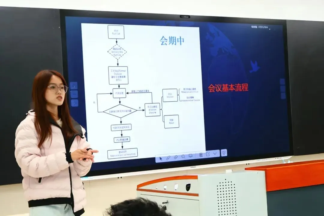 视频观看结束后,老师详细讲解了动议、问题、让渡、决议草案等流程规范,提醒同学们在会议中严格遵守规则,确保会议有序进行。针对同学们提出的疑问,老师逐一耐心解答,帮助大家扫清认知障碍,为正式开展会议做好了充分的知识储备。
