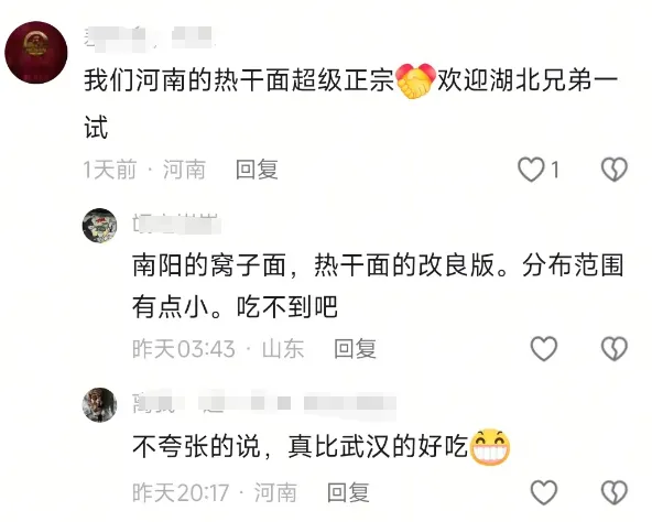 有武汉远征球迷在社媒发视频,询问郑州的美食,许多河南球迷跟帖留言,纷纷向武汉球迷推荐。而他们推荐最多的,就是“热干面”!