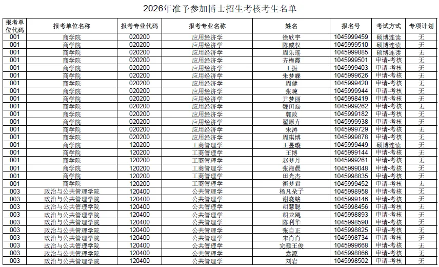 根据我校2026年博士招生相关工作安排,现将通过申请环节并准予参加考核的博士考生名单公示如下(见附件),该名单已经过报考院系核对确认,有异议的考生可联系报考院系或研招办咨询。