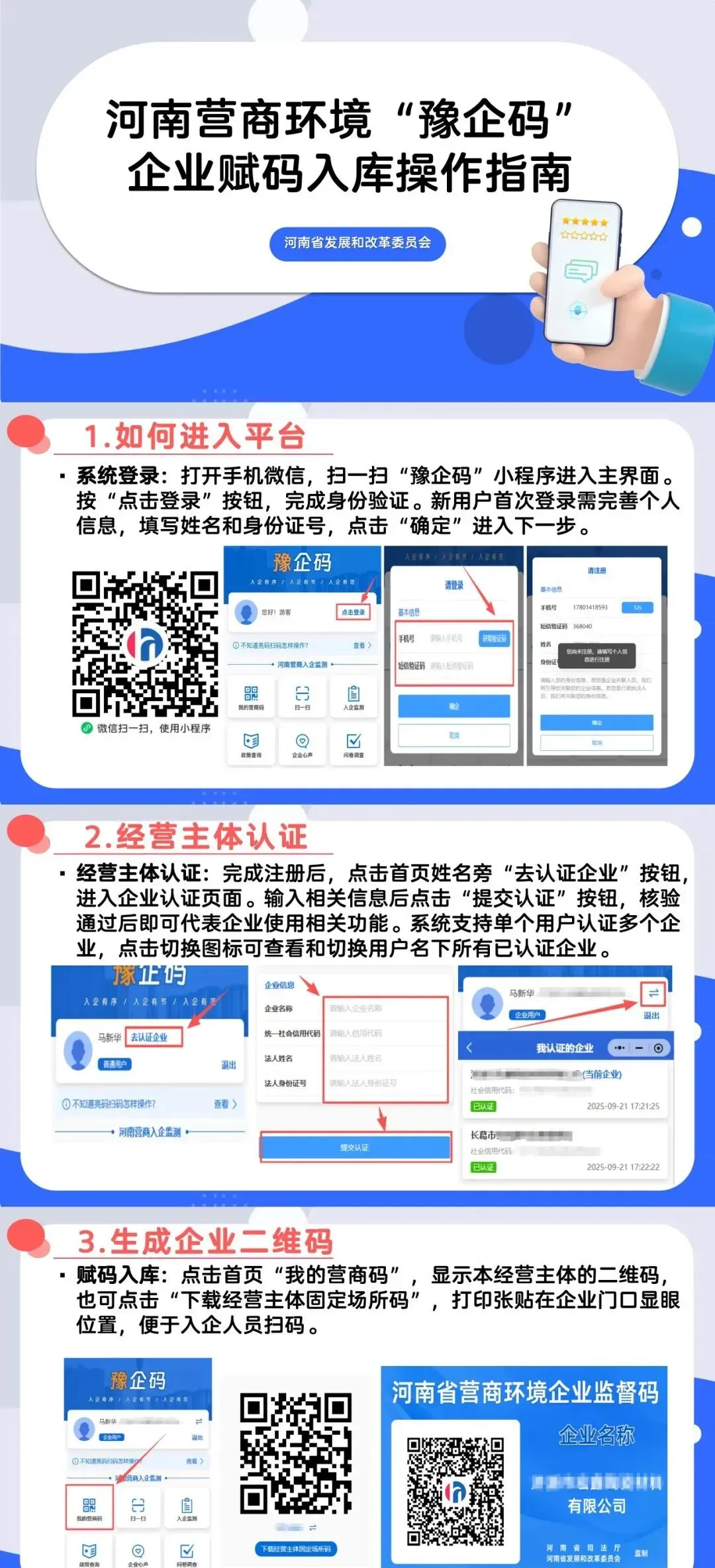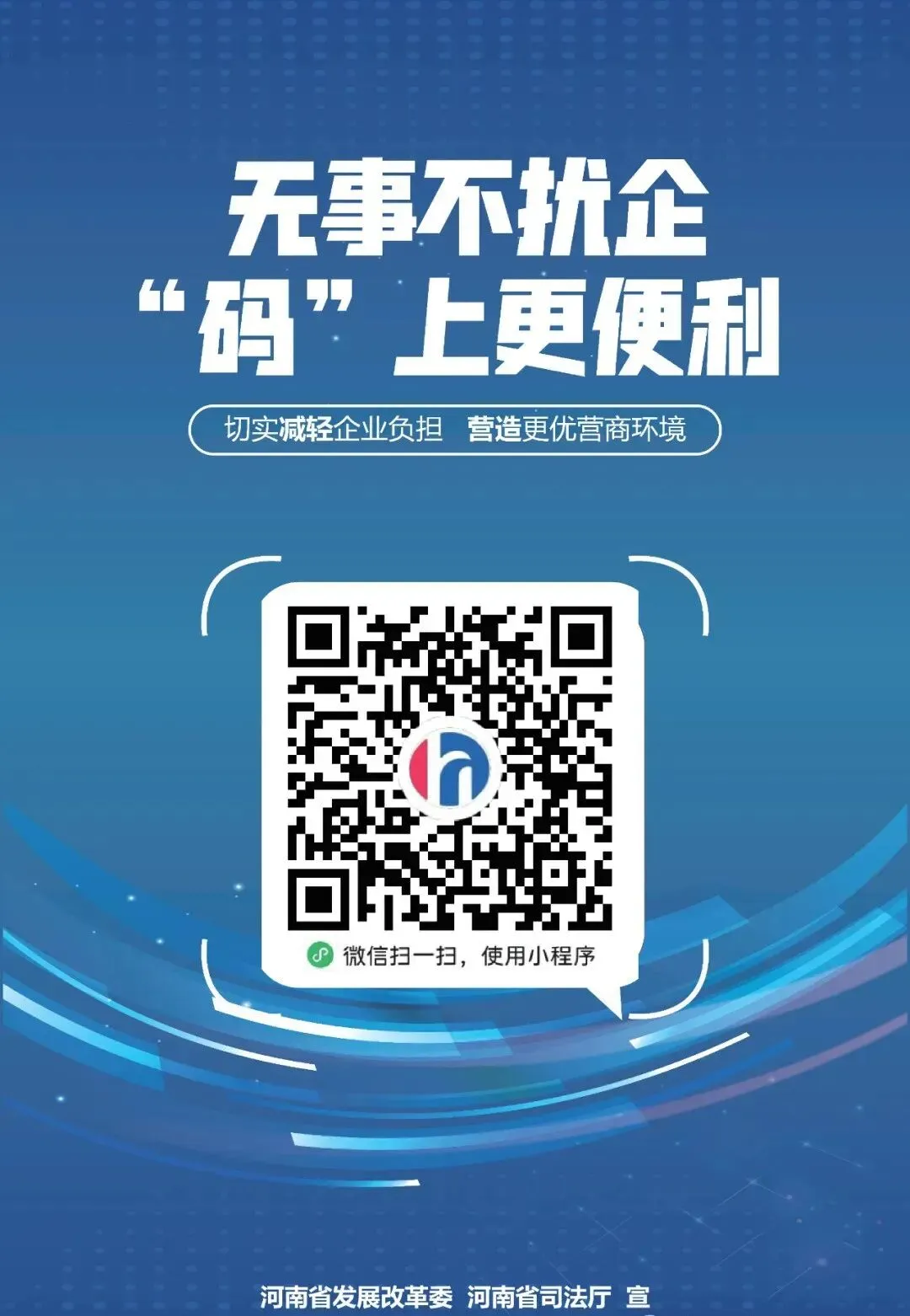 特别说明:各类市场主体均可通过微信扫描“豫企码”小程序进行登录,完成注册和认证后,系统会为每家企业生成唯一的“企业码”。企业需将该码张贴于主要出入口显著位置。平台启用后,各执法部门必须提前在省级平台上报检查计划,执法人员进入企业时需扫描企业码,方可开展检查工作。
