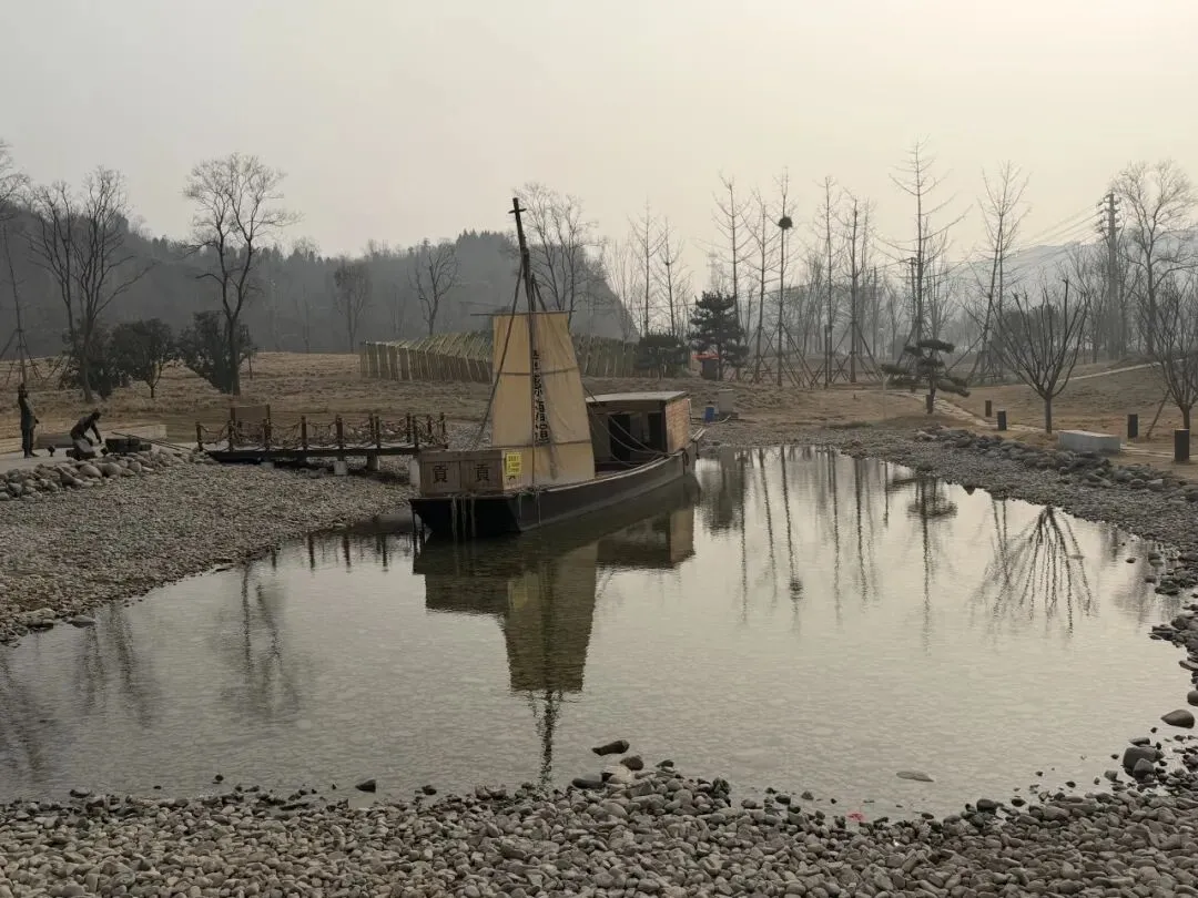 碎石模拟古河道,一艘货船停在岸边,窑匠雕塑正在搬运瓷器上船。地面还有陶瓷外销路线图——从巩县出发,沿大运河至扬州,再驶向海上丝绸之路!🚢