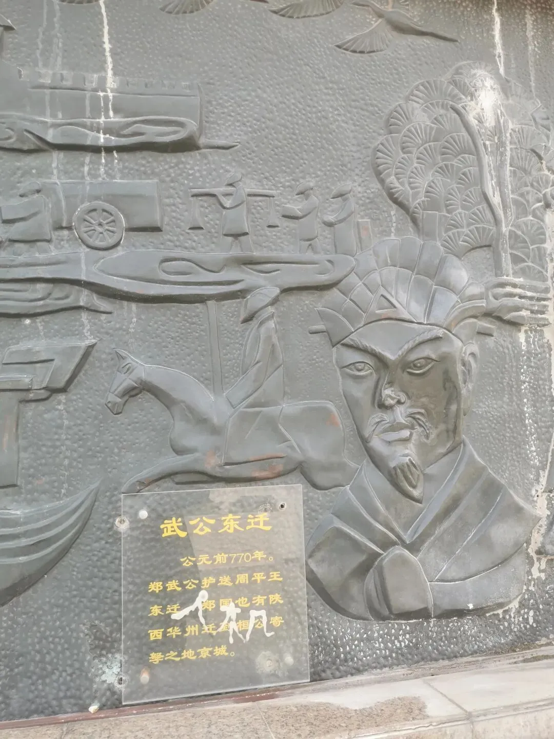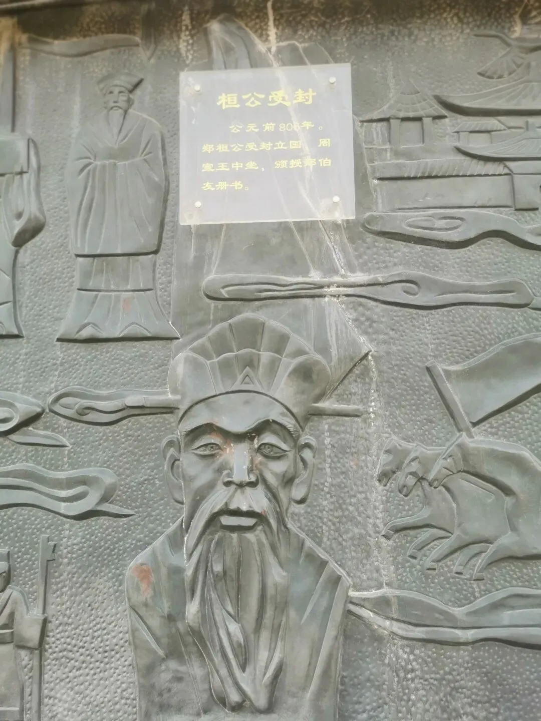 郑氏三公雕像。中间宽袍大袖者为郑桓公、佩剑者为郑武公,另一位为郑庄公