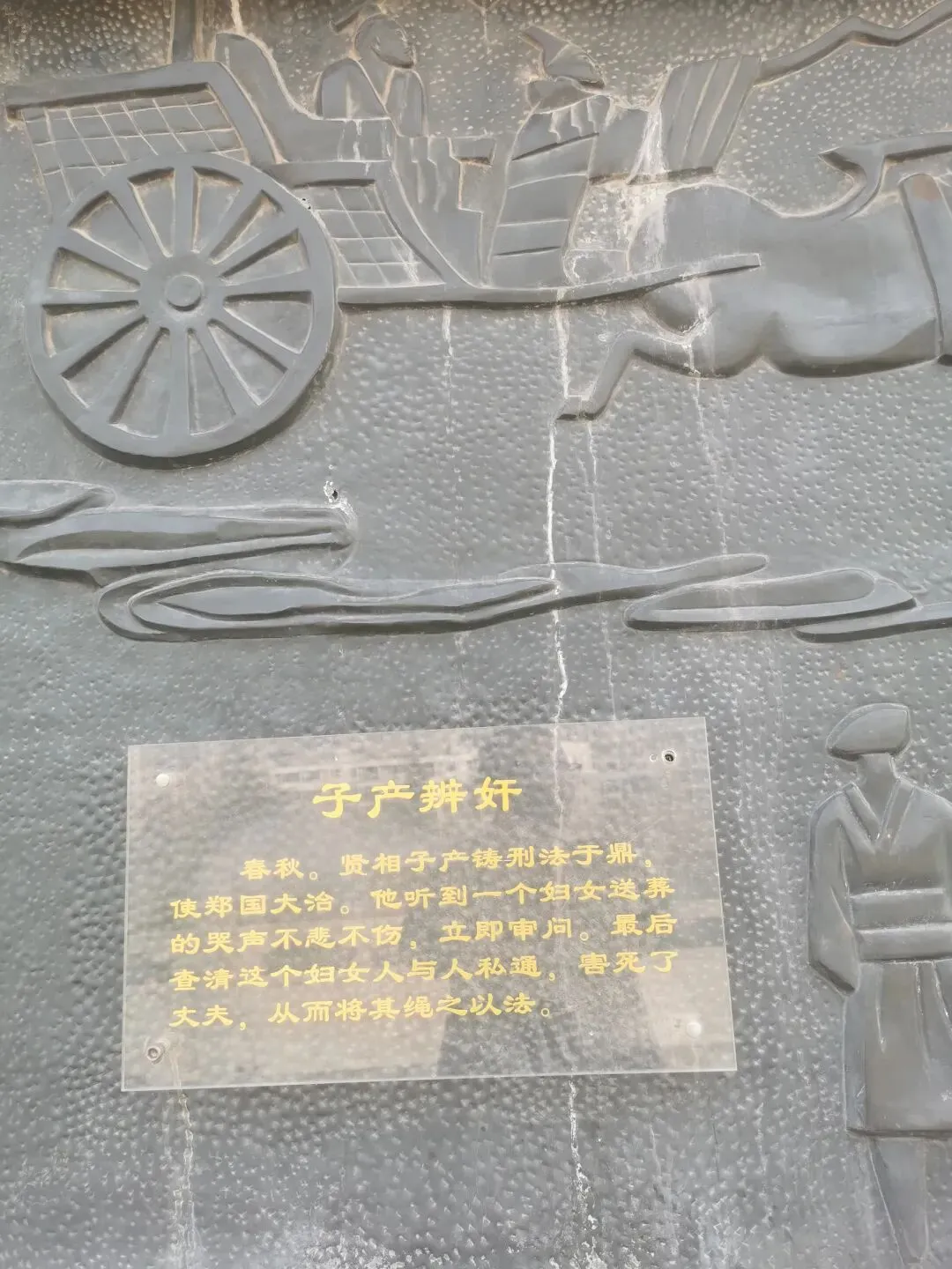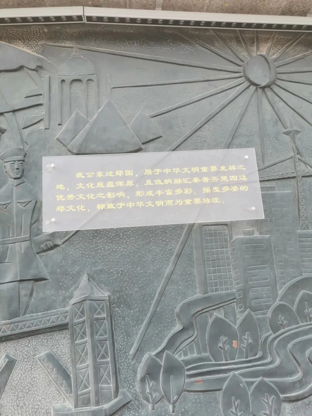 雕像底座周围,雕刻有众多关于郑国和郑氏名人故事图案。比如“武公东迁”、“郑和西洋”、“郑国修渠”、“子产辨奸”等。雕像最下底座刻有《郑氏三公像碑记》