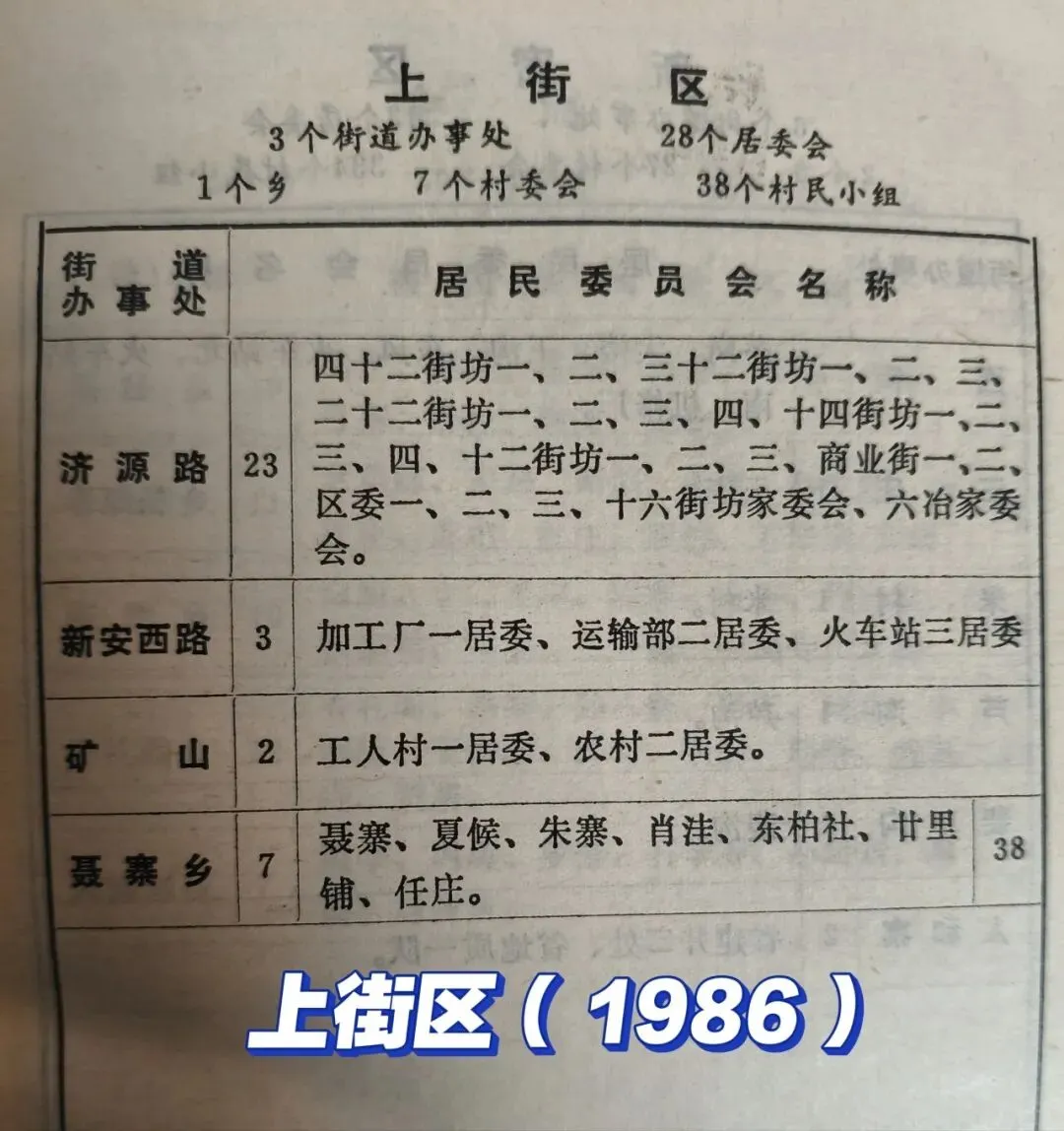 截至1986年底,上街区辖3个街道1个乡(济源路街道、新安西路街道、矿山街道、聂寨乡)。