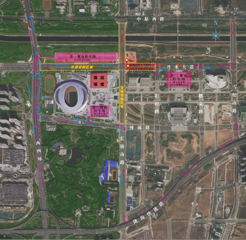 设在长椿南路与丹水大道东北角,出租车可沿雪松南路——丹水大道(向西)——在丹水大道与汇智路交叉口驶入出租车专用通道(丹水大道最北侧两排机动车道)——在丹水大道与长椿南路交叉口东北角处载客;载客后沿长椿南路向北——中原西路驶离活动现场。