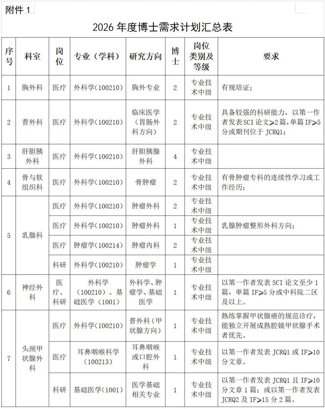 附件1:《河南省肿瘤医院2026年度博士需求计划汇总表》