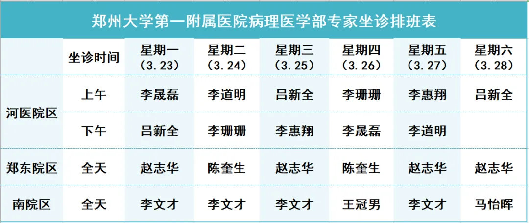 郑州大学第一附属医院病理医学部3.23--3.28三院区专家坐诊信息
