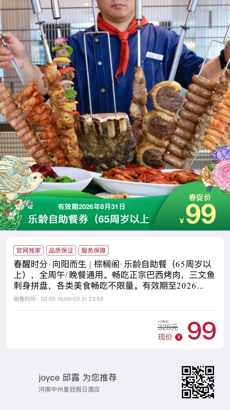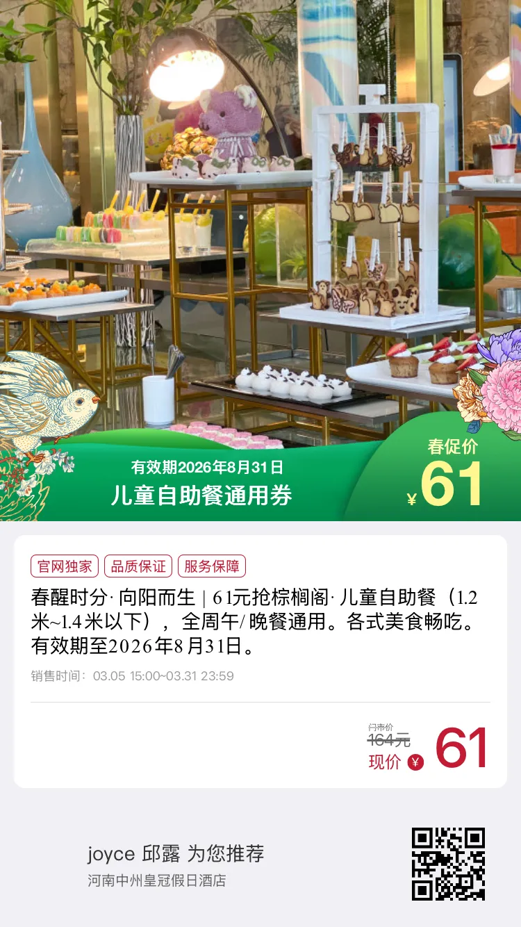 刷到就是赚到!郑州周末不用远行吃喝玩乐+拍照+遛娃+祈福全安排跟着走就对了👇📍第一站:中州皇冠假日·棕榈阁台湾美食节先预定白玉兰景观位!边吃台湾地道美食边拍春日大片粉紫玉兰+精致餐食,朋友圈C位预定🥩第二站:巴西烤肉自由时刻不用客气!坐等大厨现场投喂E人狂喜,大口吃肉超痛快想吃就大胆举手,实现烤肉自由🌸第三站:中场玉兰打卡豫园内粉紫玉兰正值盛放期阳光+花树+春风,随手拍都是壁纸短暂放空,治愈感拉满🍱第四站:回归台湾美食主场台湾美食顾问東老师亲力加持正宗台味+背后故事感拉满蚵仔煎、台式小吃…闭眼冲不踩雷周末任务:好好吃饭,快乐放空🎁第五站:#爱在春日 打卡有礼参与活动打卡就能领小礼物仪式感满满,把春日美好带回家🐎第六站:大象陶瓷博物馆(步行3分钟)免费小众宝藏馆!打卡马不慌、马上来财祈福事业顺利,拍照超有格调遛娃/约会都合适📜第七站:文庙+亳都新象带娃去文庙为学子祈福,学业顺遂逛亳都新象中式街区,一街一景超好拍郑州“小太古里”,氛围感直接拉满🥟第八站:京都老蔡记(郑州非遗)必吃非遗蒸饺!皮薄馅足、一口爆汁小朋友一人能干一笼烟火气与老郑州味道双满足💰攻略大招·春促限时价儿童:61元/位银发长辈:99元/位春促倒计时!先囤券再出发全家欢聚,性价比拉满这个周末,不赶路、只感受美食+美景+文化+烟火气一站式搞定郑州完美周末💛#郑州周末去哪玩 #台湾美食节 #郑州遛娃攻略 #郑州玉兰打卡 #中州皇冠假日酒店 #亳都新象 #郑州非遗美食 #周末Citywalk