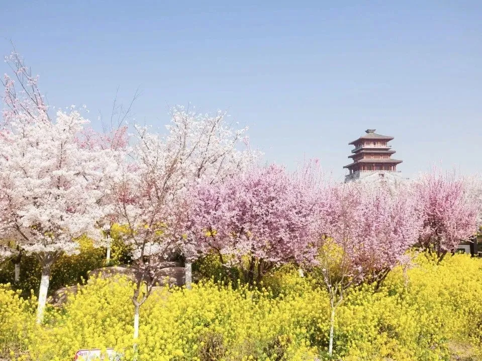 如果不想跑太远,中原路西四环须水河畔也有大片油菜花海可供观赏。但最独特的画面出现在黄河岸边的丰乐樱花园——树上的樱花与地上的油菜花同时开放,树上粉白、地上金黄,粉色花雨洒落金色海洋,交相辉映中带来无与伦比的视觉震撼。