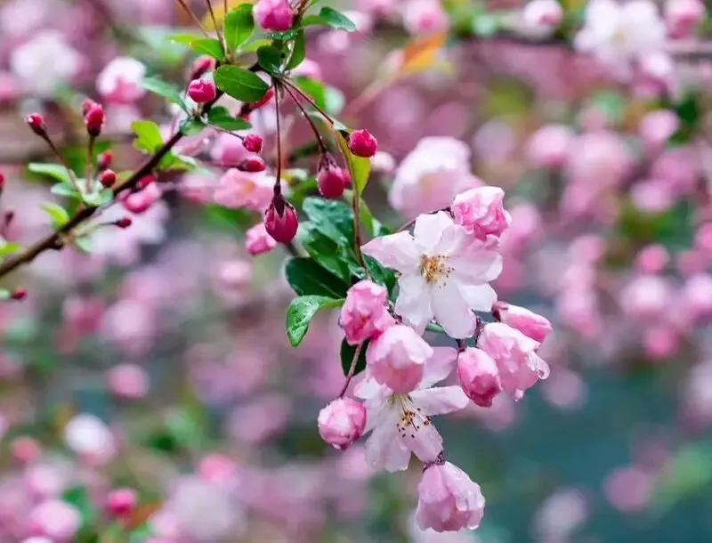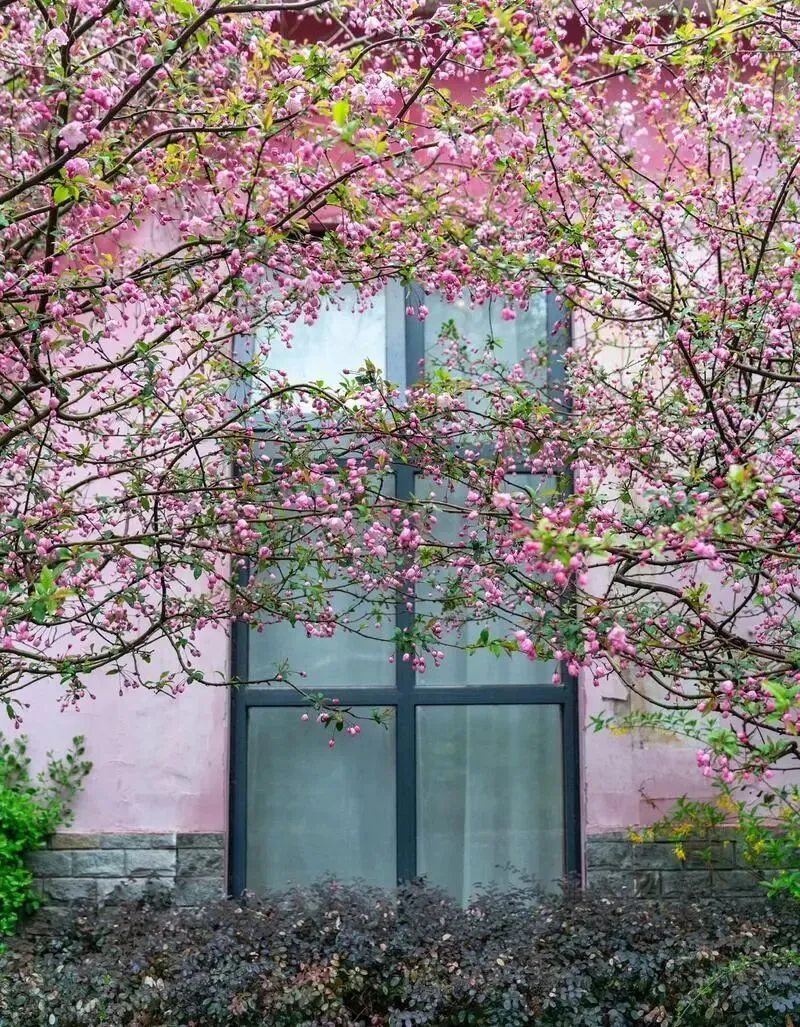 不是因为它多有名,而是每年三月底四月初,当海棠开得最盛的时候,满眼的粉红、粉白密密匝匝,压得枝条都弯了。风吹过,花瓣落了满地。花色深浅不一,有的红艳如胭脂,有的淡雅如薄粉——人们常说的“海棠红”,正是这种粉中带红、红中透粉的颜色,虽不尽然是那般浓烈,却有一种特殊的气质,让人挪不开眼。