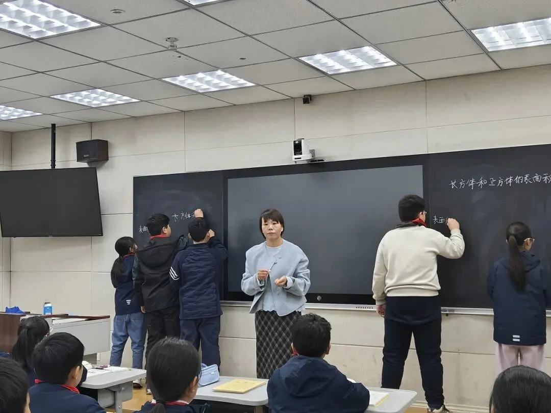 在任教授指导备课后,三位教师尝试采用分享式组织课堂教学:金梦婷老师执教语文《飞向蓝天的恐龙》,引导学生从“不敢说”走向“大胆分享”;张丹老师执教数学《解决问题——含多余条件》,让学生在小组辨析中学会筛选信息;李丽英老师执教《长方体和正方体的表面积》,以学生自主提问开启探究,真正将课堂还给学生。