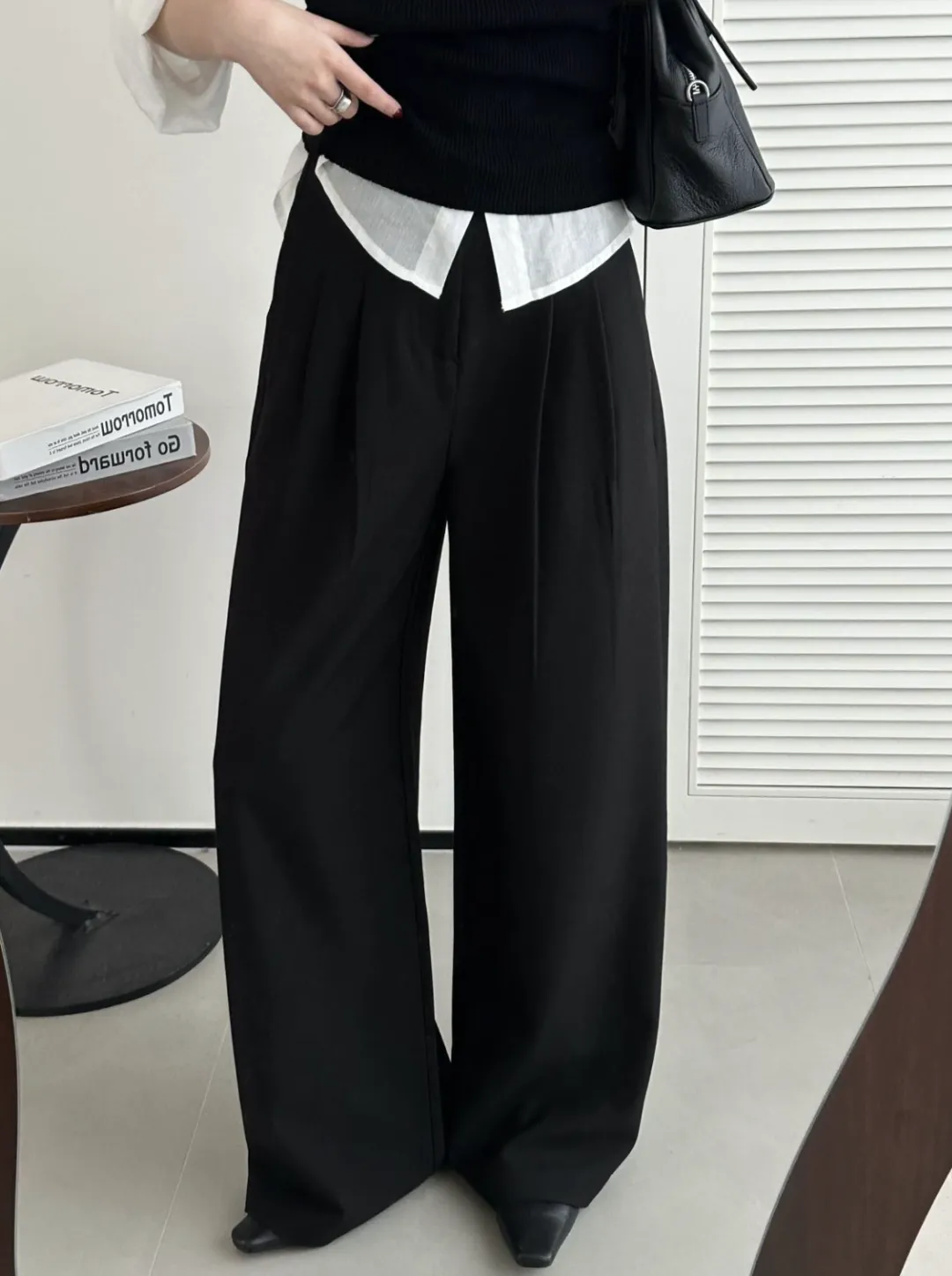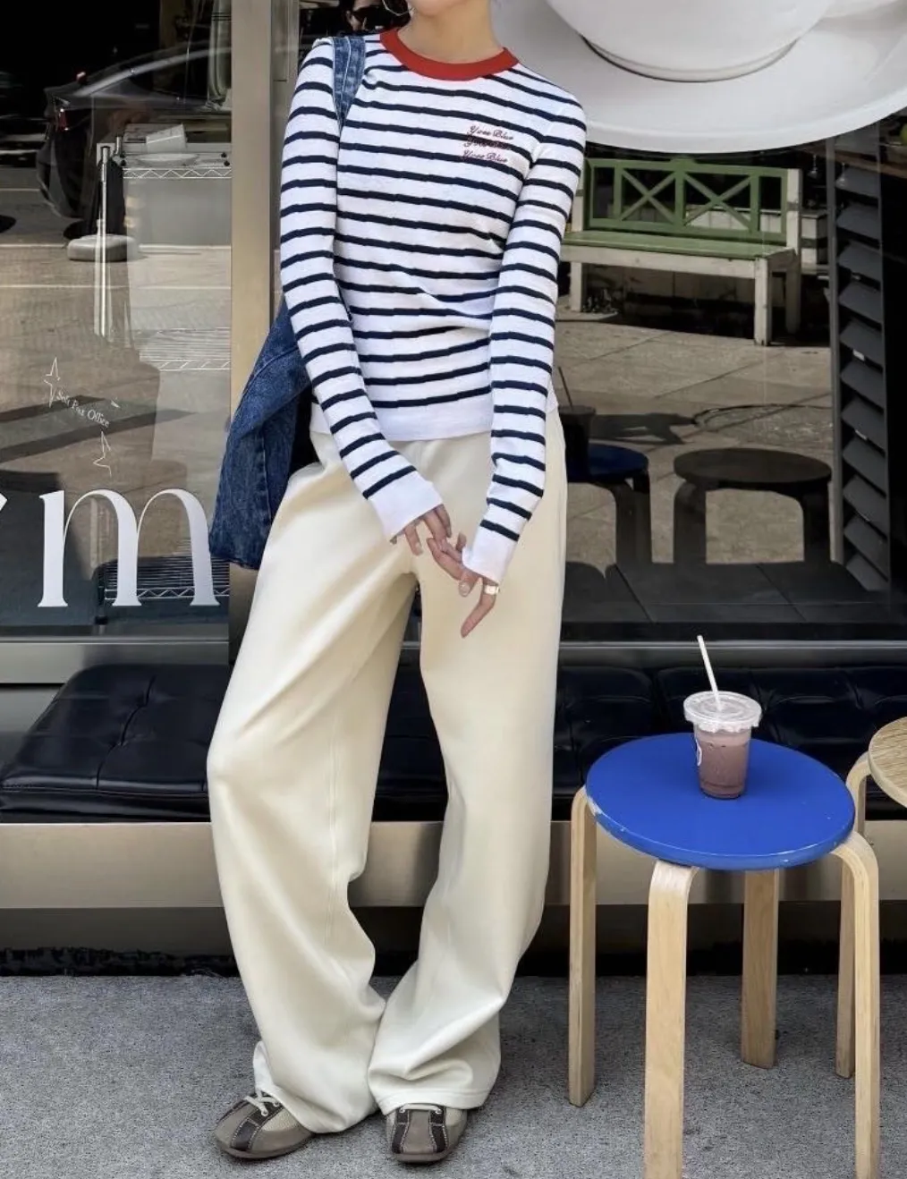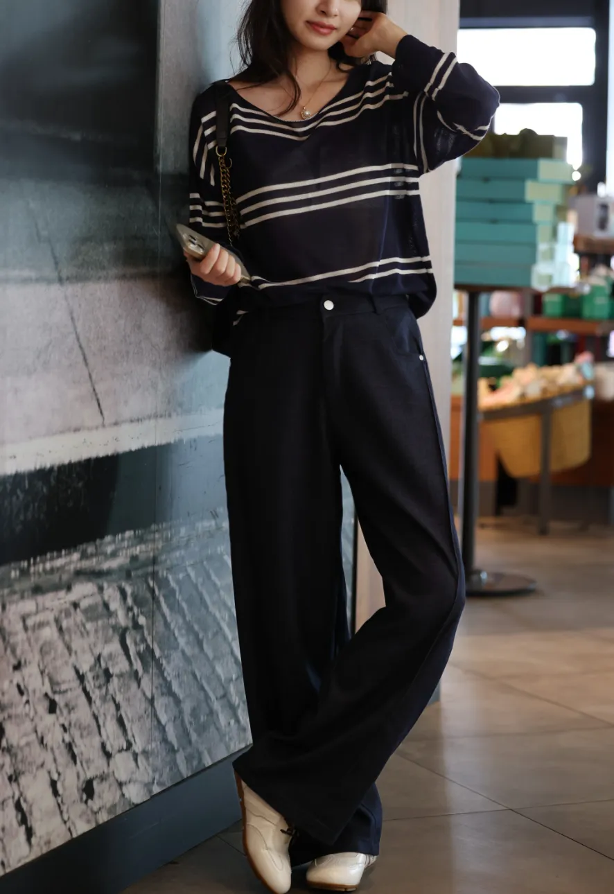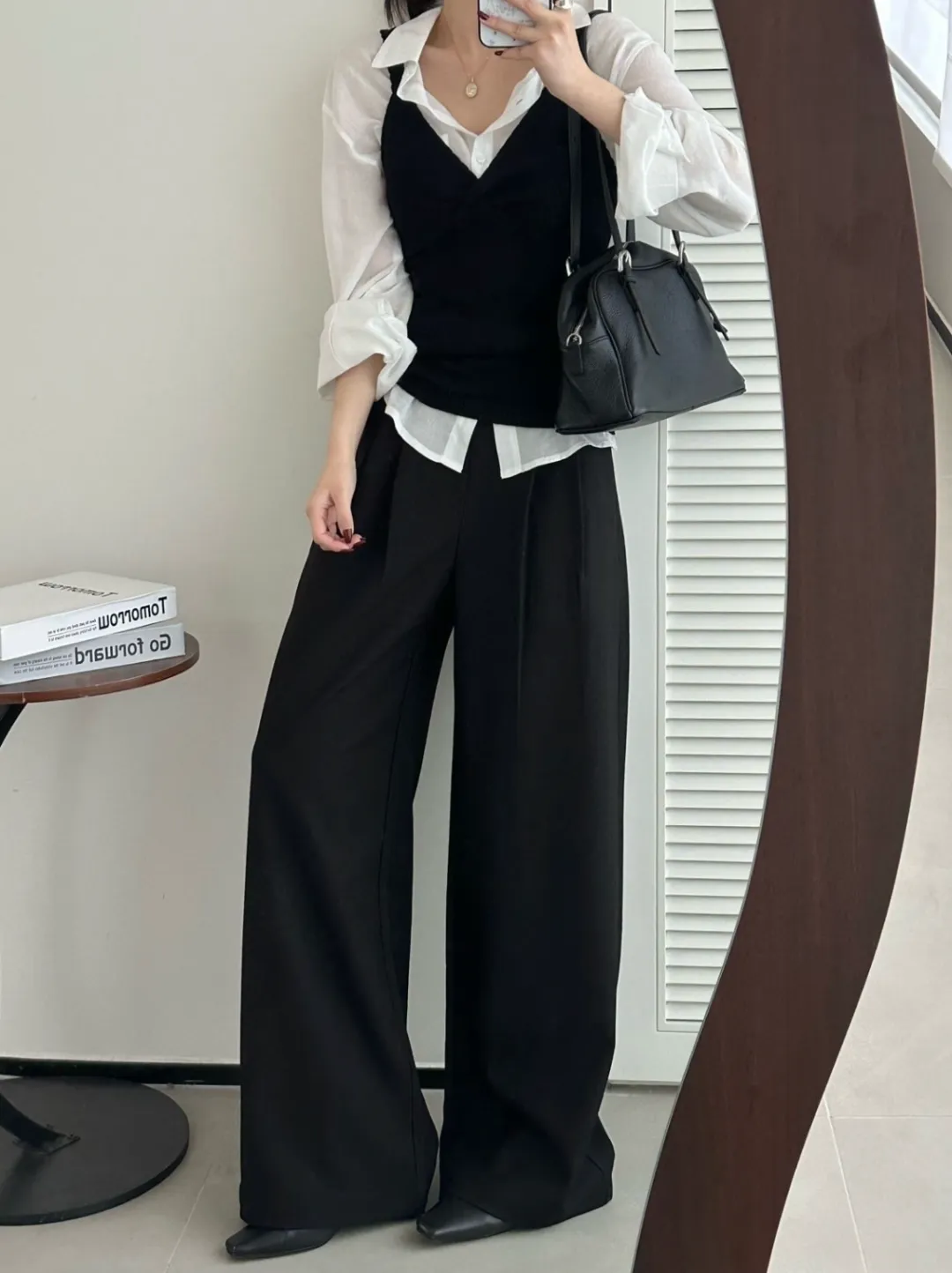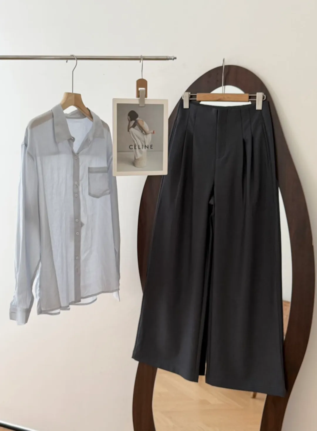 宽松的大裤腿无论腿粗还是腿细都能穿出飘逸感,轻松遮住胯部,更显瘦!通勤搭衬衫干练利落,休闲配卫衣松弛随性,约会穿针织衫温柔显贵…一裤适配所有风格,巨百搭!
