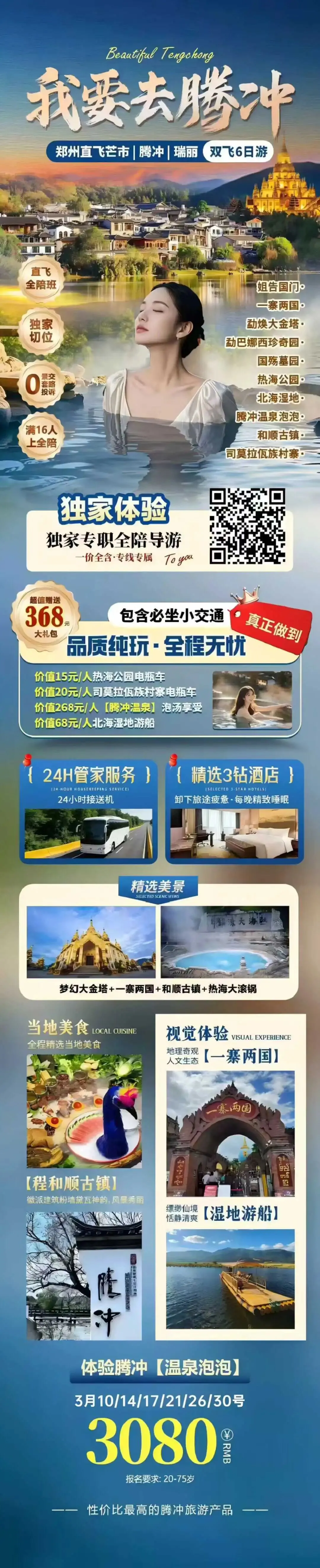 3月份【我要去腾冲】郑州直飞芒市腾冲芒市双飞纯玩6日游3080元