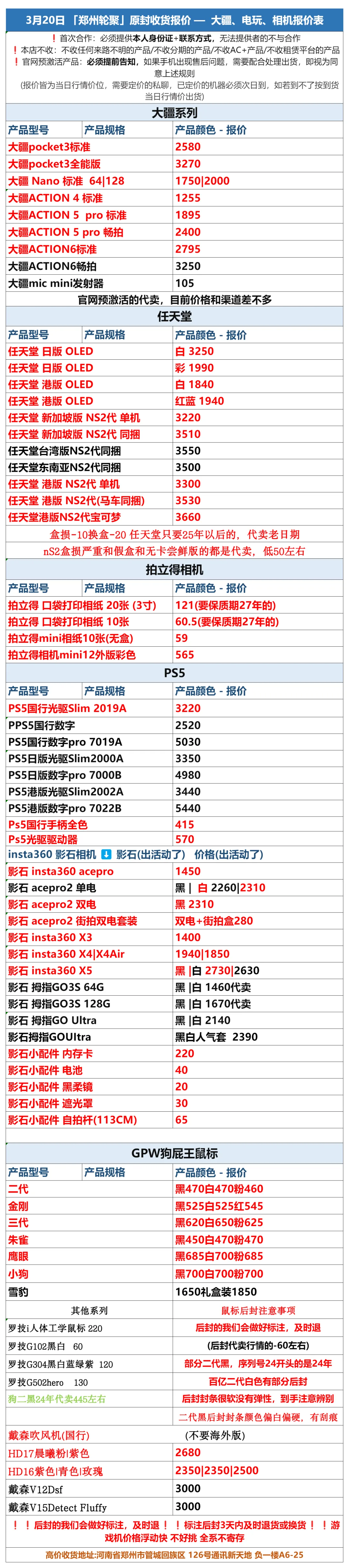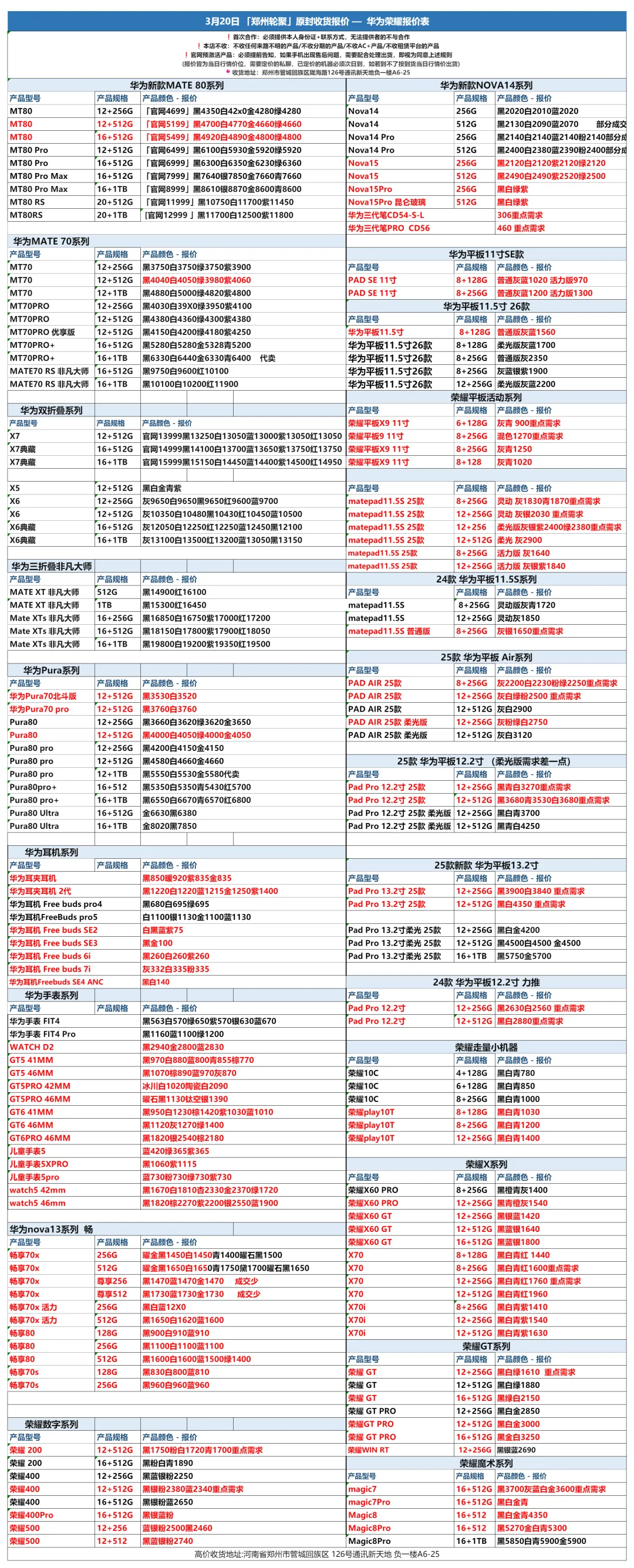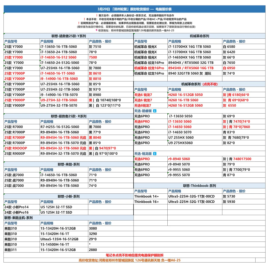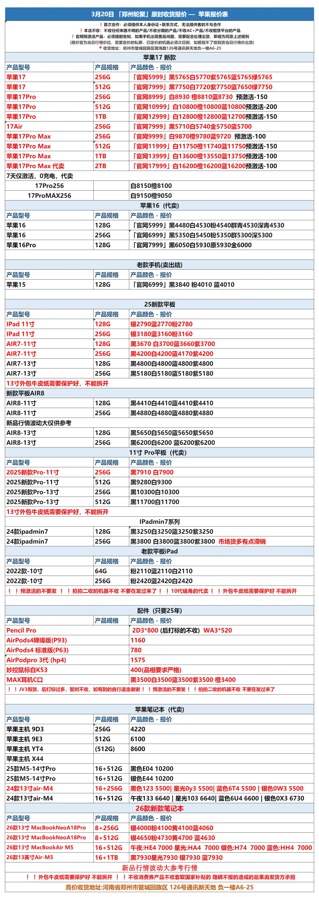 郑州轮聚通讯 2026年3.20日数码报价更新
