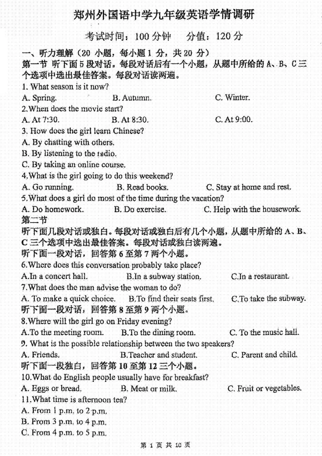 郑州外国语中学2025-2026学年九年级下学期第一次月考