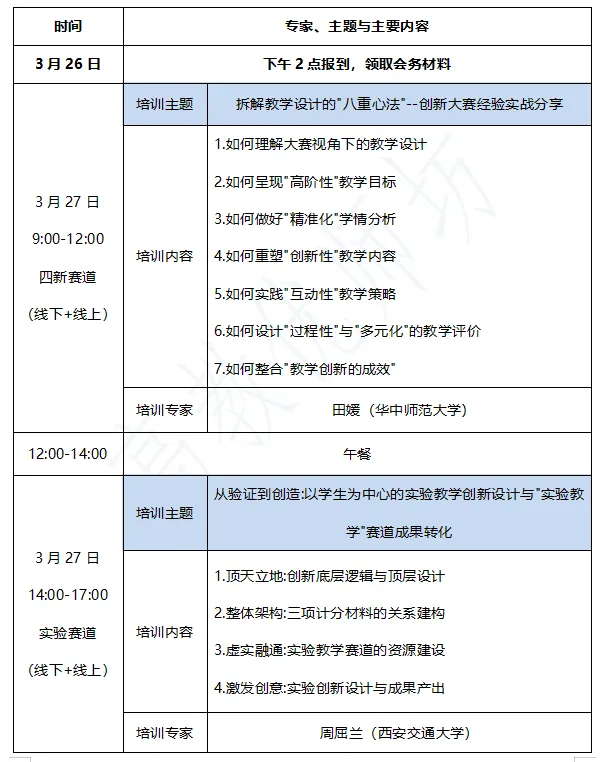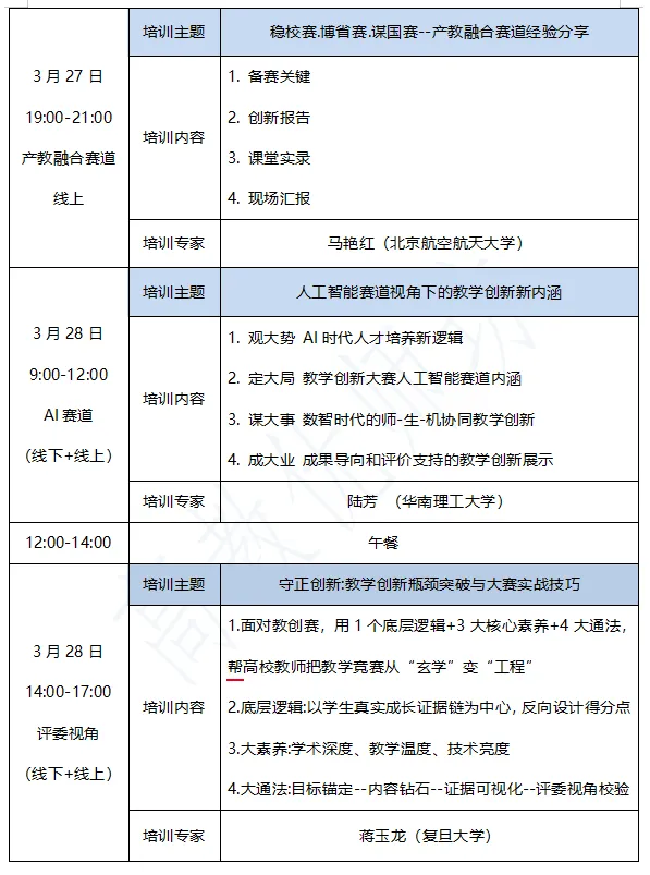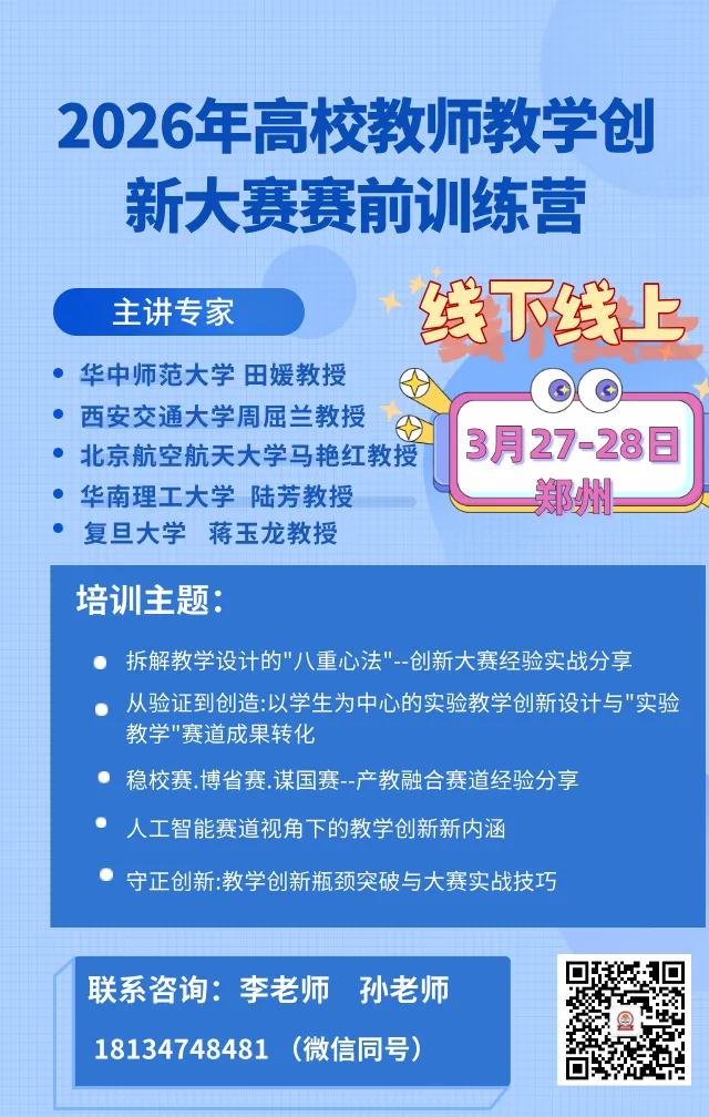 为帮助高校教师精准把握第六届教学创新大赛人工智能赛道与实验教学赛道的赛事导向,理清全流程备赛思路,破解备赛难点,系统提升AI赋能课堂创新的实践能力与赛事竞争力,切实推动赛事备赛与日常教学改革深度融合,助力教师在新赛道中脱颖而出,高教优师坊特举办“2026年高校教师教学创新大赛赛前训练营”,现将具体安排通知如下: