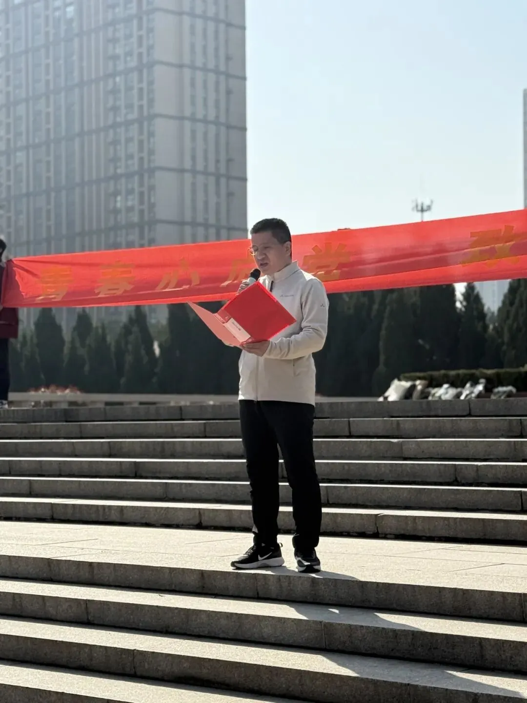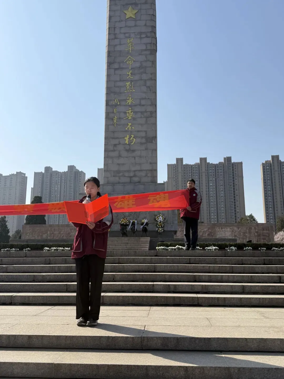 祭奠仪式在人民英雄纪念碑前正式举行。全体师生肃立默哀一分钟,向为民族独立、人民解放和国家富强英勇献身的革命先烈致以深切哀思。随后,学生会主席、八年级7班胡若素同学作为学生代表发言,她以真挚的情感表达了对先烈的崇敬之情,号召同学们以先烈精神为灯塔,勤学笃行、锤炼品格。副校长黄建康在致辞中向全体学生骨干提出三点期望:以信仰为旗,做红色基因的传承者;以责任为舟,做躬身实践的先行者;以奋斗为桨,做时代使命的践行者。他勉励同学们铭记历史、勇担使命,以实际行动践行“强国有我”的青春誓言。