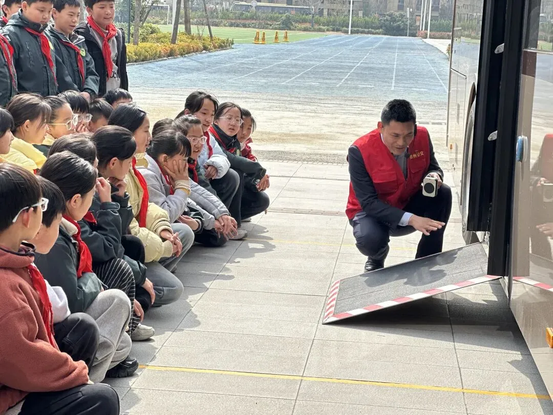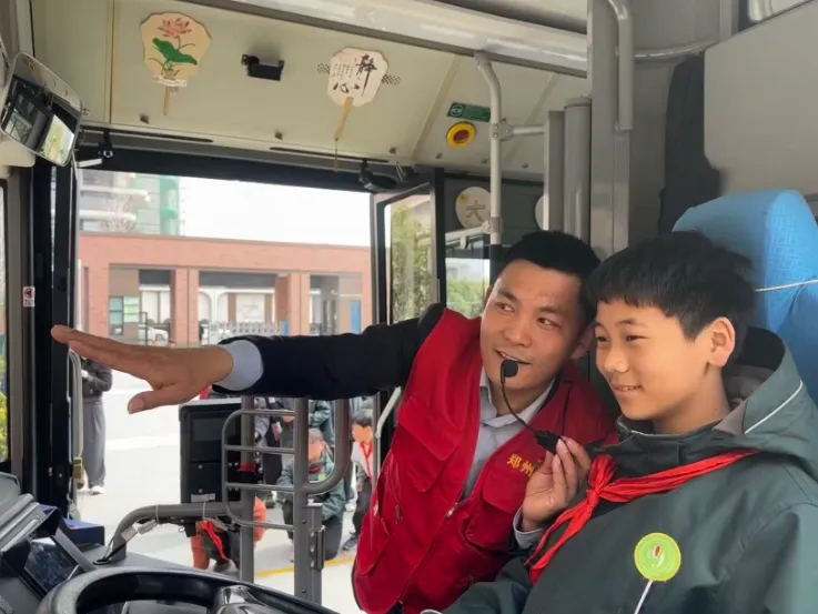 雷锋精神宣讲活动结束后,随行公交志愿者郑豫炜带领同学们走进199路“儿童友好线路”车厢,围绕公交乘车安全与文明出行开展科普讲解,并结合小学生日常出行特点,用通俗易懂、生动有趣的方式,重点讲解文明排队、有序上下车、上车坐稳扶好、不将头手伸出窗外、主动礼让老弱病残孕乘客等乘车礼仪与安全规范。同时,邀请同学们坐上驾驶座,化身“小小车长”沉浸式体验,详细介绍车内安全设施、车辆盲区及紧急情况下的自我保护方法等实用知识。通过现场问答、情景互动等形式,同学们在轻松愉悦的氛围中熟练掌握安全乘车技能,进一步增强了交通安全意识,提升了公共文明素养。