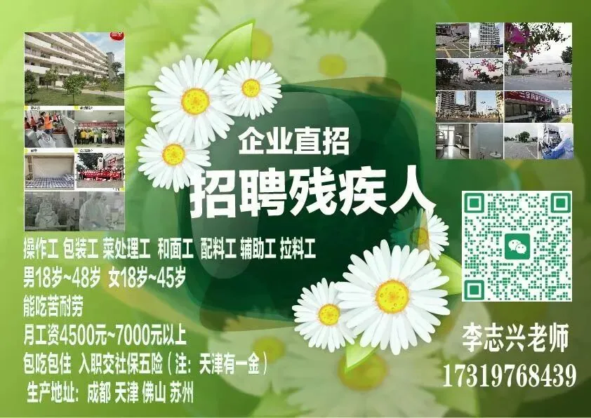 三全召唤、职等你来!面向社会招聘残疾人:🔴招聘条件:1、持有效的残疾证和二代身份证。2、年龄18-45岁,性别不限。3、初中以上文化程度,吃苦耐劳,爱岗敬业,有团队意识,聋哑人会手语沟通,轻微肢体、听力。4、身体健康,无传染疾病,态度端正,作风正派,遵守厂纪厂规。5、吃住全免,省外报销路费。6、入职缴纳五险。7、招聘岗位:计时、计件。8、工作地点:郑州二基地有需要的可微信联系17319768439李志兴