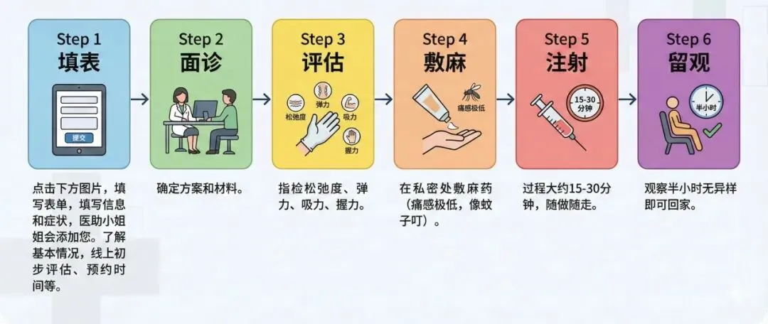优势:在于微创、恢复快,治疗过程像打针一样,创伤小、痛感低,不影响日常工作生活适合对手术有顾虑、时间紧张,希望快速改善或初次尝试私密紧致项目的人(注意:如果是严重的肌肉断裂或脏器脱垂,打针是解决不了的,得手术!)