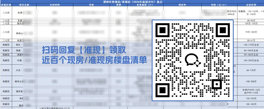 对于购房者来说,买期房最担心的莫过于交房时间的不确定性和房屋质量是否达标。而准现房则能让你在付款后不久就能拿到钥匙,甚至可以在购买前实地考察房屋质量和小区环境,大大降低了购房风险。今天,我为大家盘点了2026年郑州各区域即将交房的新房小区,按区域划分,标注交房时间和总价范围,供你参考。为了帮助大家更好地比较和选择,我特别整理了一份详细的Excel表格,里面包含了2026年交付的这些项目以及目前在售的部分现房项目,共计近百个。表格中不仅有总价段和交房时间,还有面积段、成交均价、得房率、配套学校等等关键信息,让你一目了然,轻松对比。如果你正在考虑买房,这份资料一定能帮到你。扫描下方二维码,添加好友,回复【准现】,即可免费领取这份表格。数量有限,先到先得哦!中建泊悦府预计2026年12月底交房,总价150-390万左右,底跃顶跃的价格偏高一些。位置在双湖板块,纯洋房社区。郑轨云麓预计2026年9月底交房,总价125-220万。该项目最大的优势是地铁上盖,且地铁入户,交通便利。正弘序作为正弘置业的高端“序”系列作品,一批次预计2026年12月底交房,总价245-500万。主打大平层产品,以其高新老城核心位置+第四代住宅的设计理念吸引改善客户。高新城开松云缦预计2026年9月底交房,总价64-177万。项目与郑轨云麓同属五龙口板块,毛坯交付。远洋瑞林宸章首批次预计2026年12月底交房,总价91-227万。该项目位于管城区紫荆山南路与郑航北路交叉口,三环内,距离2号线花寨站比较近。金域华府预计2026年4月交房,总价170-360万,位置还不错,算是二环旁,距离4号线果树所站大约400米,有洋房产品。鑫生坤悦居预计2026年4月底交房,总价136-237万,洋房小区,虽然是二环的位置但是周边小范围界面略差。招商时代映江河预计2026年11月底交房,总价115-155万。映江河是招商时代系的三期,也是离地铁最近的一期(离地铁4号线老鸦陈站约150米、离3号线省体育中心站约600米),得房率也更高。万科翠湾中城三期首批次2026年11月底交房,总价116-165万,精装修交付。旭辉一江云筑一期已经交付,二期9-10-13号楼预计2026年12月底交,总价95-150万,贾鲁河畔,小区有高层有洋房,可以上惠济区实验小学英才校区+惠济外国语。万科民安云河锦上部分楼栋已在今年1月中旬交房,19-20号楼在2026年6月交房,2-3号楼在2026年底交房,总价106-410万,精装修交付的小区。绿都青云叙预计2026年7月底交房,总价95-123万左右,位置在惠济西,周边界面略差。电建臻河府预计2026年6月交房,总价185万起,由央企电建开发,纯洋房社区,只有一个142㎡户型。金投申泰中原印象预计2026年9月底交房,总价140-270万,金水主城二环的位置,苦在项目规划有点乱。城发玥园预计2026年4月底交房,总价150-230万,位置不错,花园路国贸旁,只有两栋楼,一栋高层+一栋小高。康桥香麓湾预计2026年5月底交房,总价290万-900万,曾经的亚洲最佳新锐豪宅,超白玻+铝板的外立面非常独特亮眼,保交楼项目,属于鸿园板块,位置靠近贾鲁河。信达天樾九章二期2026年6月交房,总价145-310万,金水北的央企准现房,一期的交付品质还不错。保利大都汇部分楼栋已经交付,13-19-21-23号楼预计2026年3月交房,9-22号楼预计2026年5月底交房,总价140-300万,纯小高层社区,一梯一户精装修。越秀天悦江湾1-8号楼已经交房,剩余楼栋分两批,一批是2026年6月交房,一批是2026年9月交房,总价155-265万左右,目前的呈现品质非常不错,金水北的明星小区。美盛臻湾一品预计2026年12月底交房,总价235-336万,金水北大平层、一梯一户,纬五路一小+金水外国语双学区。美盛金水印二期预计2026年10月交房,总价220-400万,作为美盛地产的标杆作品,二期在一期基础上全面升级。碧桂园云境75平的已经交房,89-115-120平的2026年6月交房,总价65-195万,离地铁4号线陈寨站约150米,农科路小学国基路校区。正弘璟云筑一批次已经交房,剩余2026年5月交房,总价140-200万,位置在杨金。金茂越秀未来府一期二期已经交房,三期2026年9月底交房,总价140-330万,老经开的独苗苗了,地块较大,距离12号线梁湖站比较近。和谐山和府预计2026年12月底交房,总价470-2300万,经开区的高端住宅项目。兰溪府和苑已经交房,欣苑2026年9月交房,总价350-730万,可以上清华附中。电建中原华曦府一期已经交房,还入选了“2025河南省十大交付力作品”,二期预计2027年5月底交房,二期总价220-520万,央企电建开发,中原二环的地段,可封窗。中海时光之境一期2026年6月底精装交付,二期2026年10月底交付,总价360-500万,二砂板块,品质改善,但基本没啥房了。融创御湖宸院预计2026年4月底交房,总价100万-150万,周边城市界面一般,配套匮乏。碧桂园云湖天境一批次已经交房,8号楼预计2026年9月底交房,总价240-450万,常西湖的大平层。凯田秀水湾预计2026年6月交房,总价106-131万,最大的亮点就是距离地铁14号线市民中心站不远,项目是经适房转商品房,品质存疑,户型偏大。二七区在售的项目没有今年能交付的,但是有四个现房项目,具体扫码领取准现表格查看。以上就是2026年郑州各区域即将交房的新房小区盘点。总体来看,2026年郑州楼市将迎来一波交房高峰,覆盖从刚需到高端的各类产品。特别是金水区、中原区、高新区和惠济区,交房项目最多,选择性也最大。对于购房者来说,2026年交房的项目意味着等待时间较短,是准现房置业的好时机。无论是刚需还