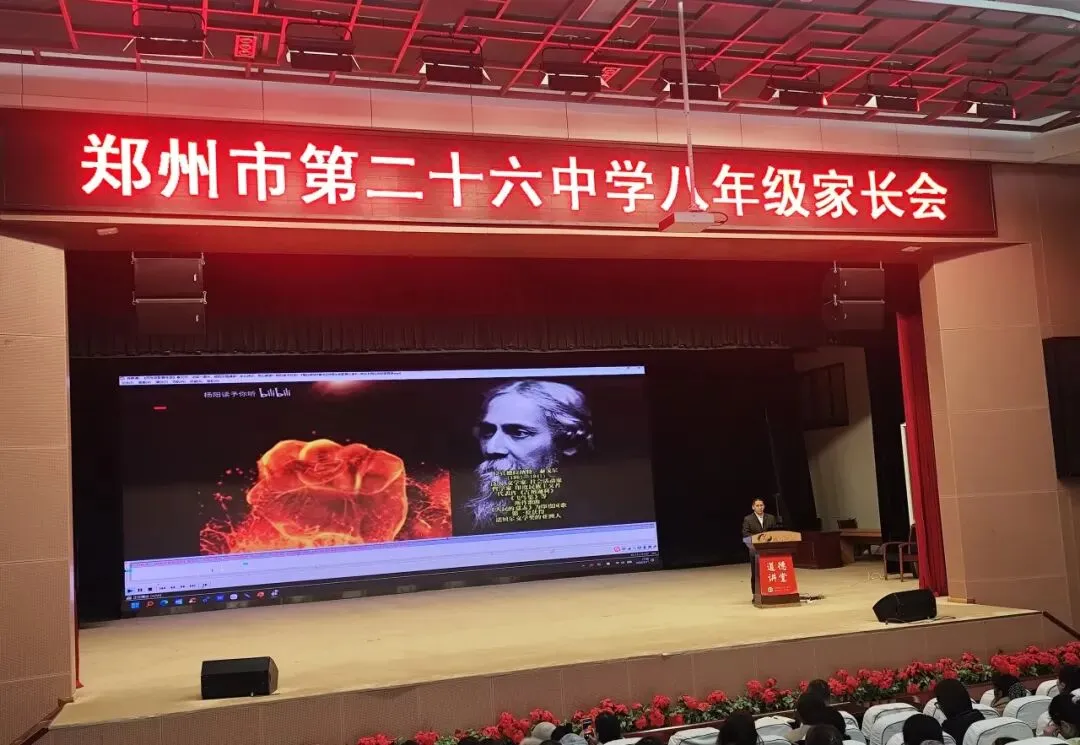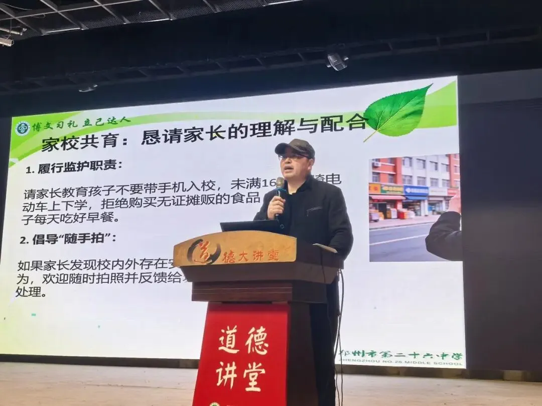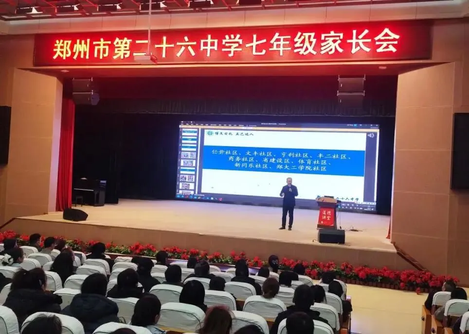开门办学,同心同行,是郑州市第二十六中学始终坚守的家校共育理念。为进一步凝聚家校合力,提升育人实效,2026年3月16日、17日下午,学校分别在体育馆一楼报告厅召开了七、八年级家长课堂。政教处主任王磊、德育副校长黄建康分别在两场家长课堂上讲话,党总支书记程雷分别作总结,全体七、八年级家长分场参会,现场气氛庄重而热烈。