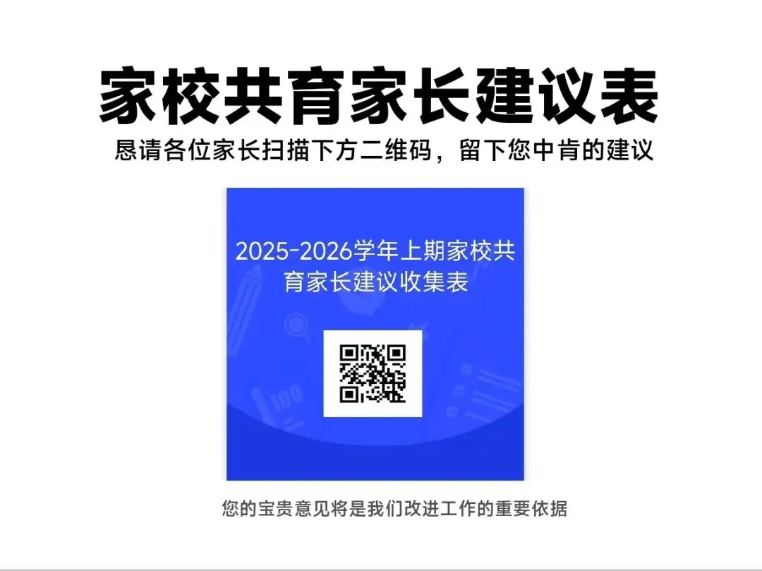 本次家长课堂特别设置了“家校共育家长建议表”电子扫码环节,家长们可通过手机扫描二维码,匿名或实名提交对学校工作的意见与建议。学校将认真梳理、逐条回应,真正做到“开门办学,问需于民”。