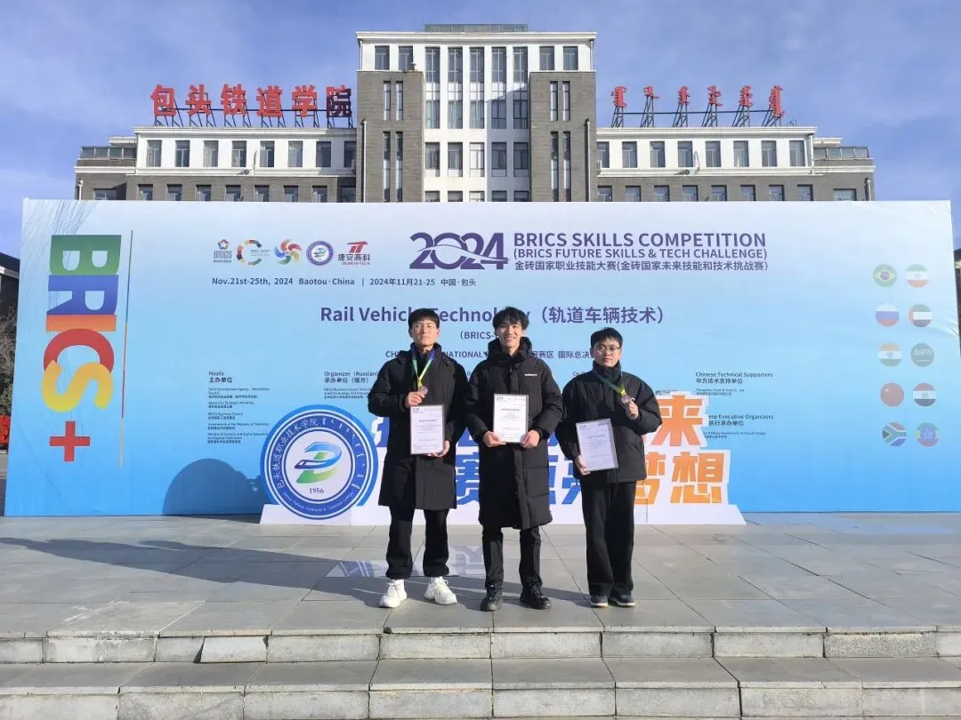 2024年11月,王威祥、丁建翔同学在金砖国家职业技能大赛(轨道车辆技术)国际总决赛中斩获中国分赛区一等奖,荣获优胜奖。