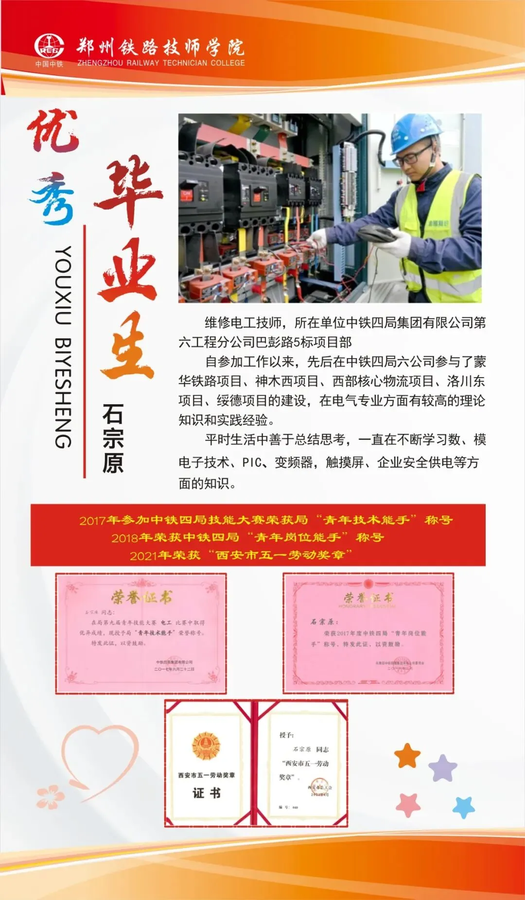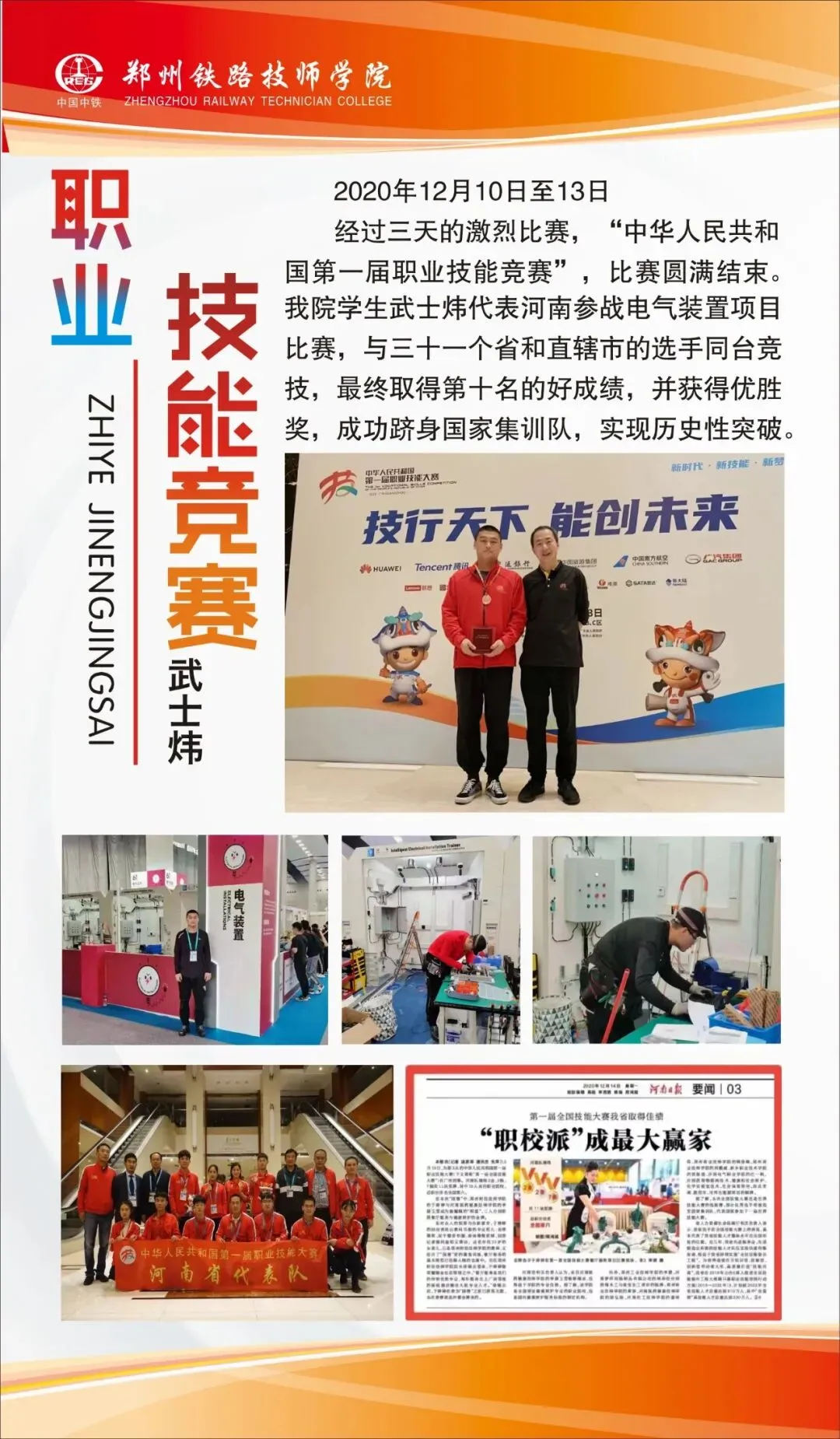河南省赛起重设备应用技术赛项第一名;全国第二届职业技能大赛起重设备应用技术赛项优胜奖;郑州市电工技能大赛第一名