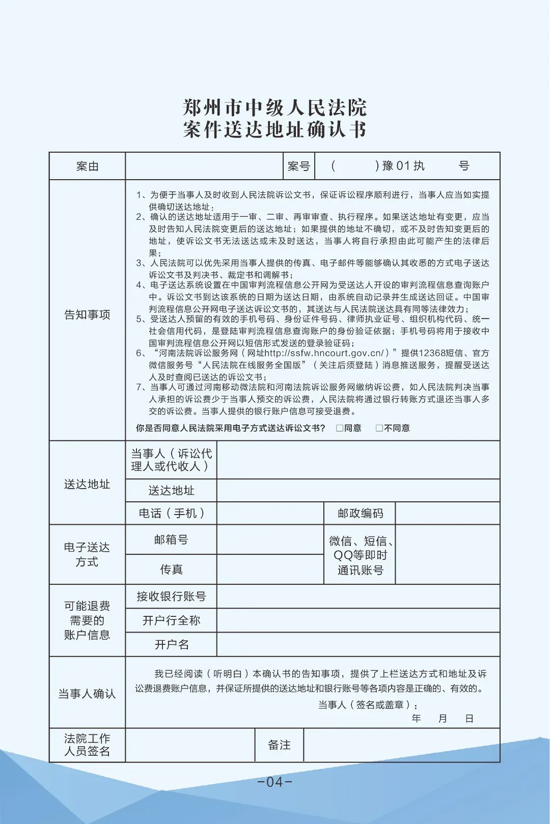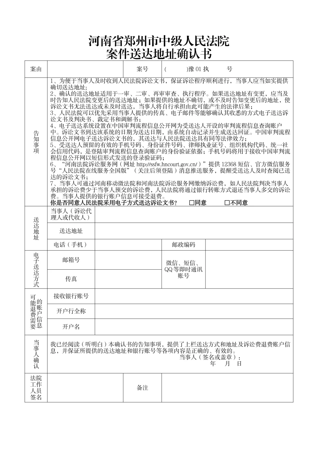 附件1:河南省郑州市中级人民法院案件送达地址确认书