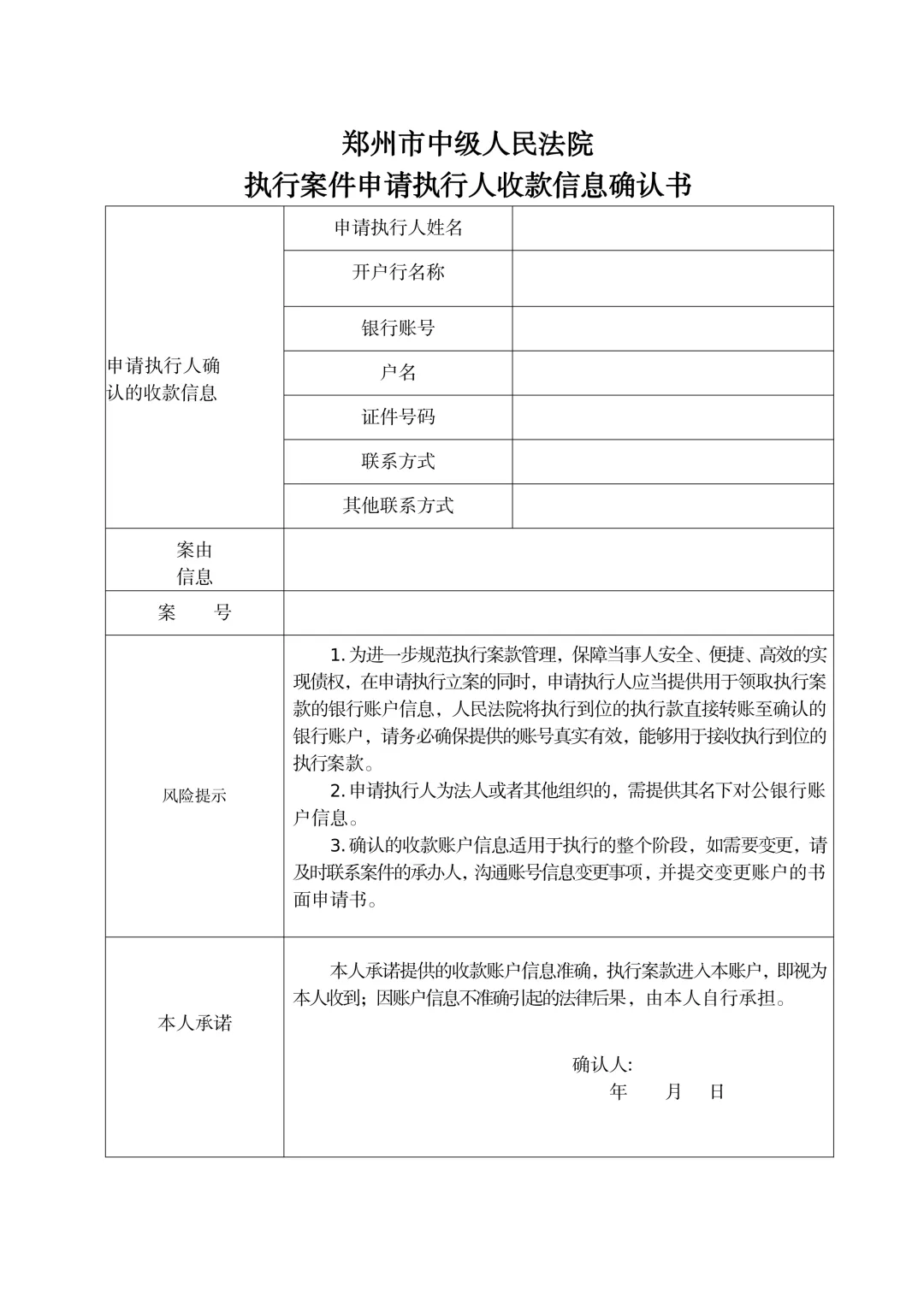 附件 2:郑州市中级人民法院执行案件申请执行人收款信息确认书