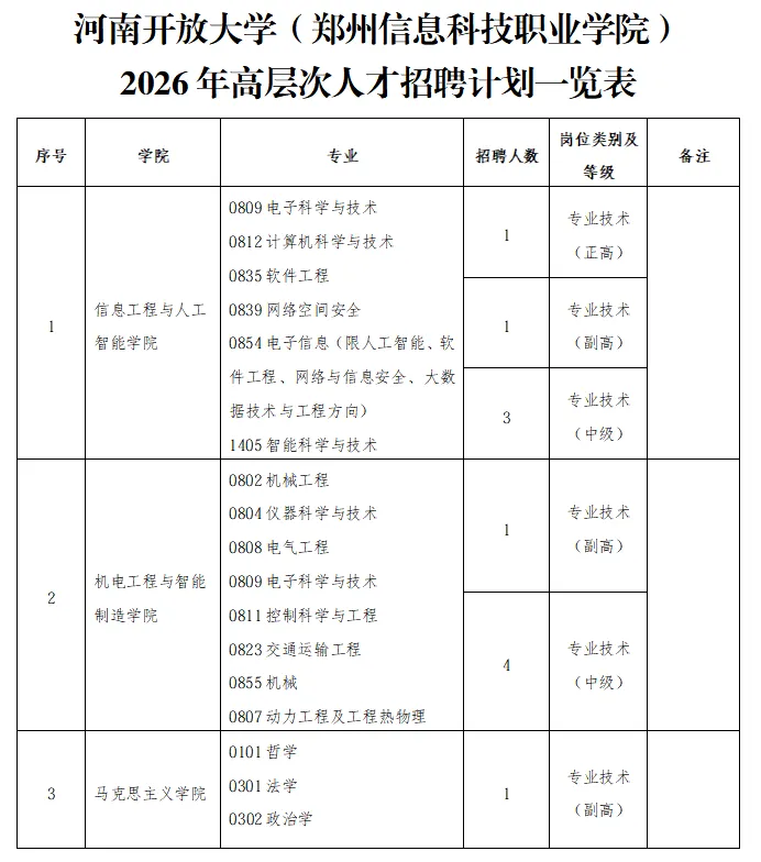 根据我校岗位空缺情况和事业发展需要,2026年拟公开招聘领军型人才、优秀博士、高技能人才、行业资深实践型人才20人。详见《河南开放大学(郑州信息科技职业学院)2026年高层次人才招聘计划一览表》(附件1)。
