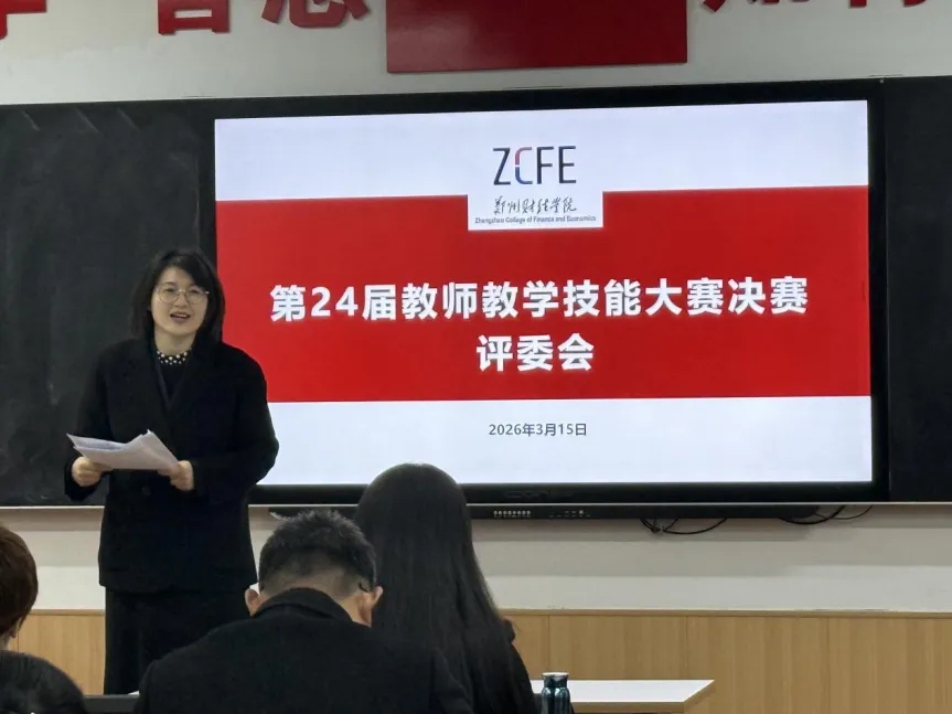 3月15日,郑州财经学院第24届教师教学技能大赛决赛在育明楼顺利举行。本次大赛由教务处主办,以“推动教学创新 培养一流人才”为核心导向,旨在深化教育教学改革,落实课程思政建设要求,以数智化赋能教学创新,筑牢人才培养教学根基。经各教学单位初赛推荐、学校复赛遴选,全校116名参赛教师中,57名优秀教师脱颖而出晋级校级决赛。