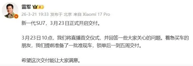 3月21日,雷军宣布新一代SU7,3月23日正式开启交付。“3月23日10点,我们将直播首交仪式,并回答一些大家关心的问题。着急买车的朋友,我们提前准备了一批准现车,锁单后一到五周交付。 希望这次交付能让大家满意。”(@雷军)