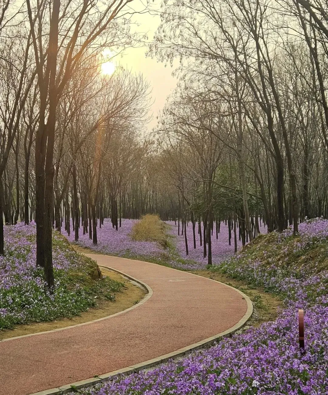 3月中下旬至4月上旬盛放,一号健康步道一公里处,林下紫雾如毯,宠物友好、人少静谧。