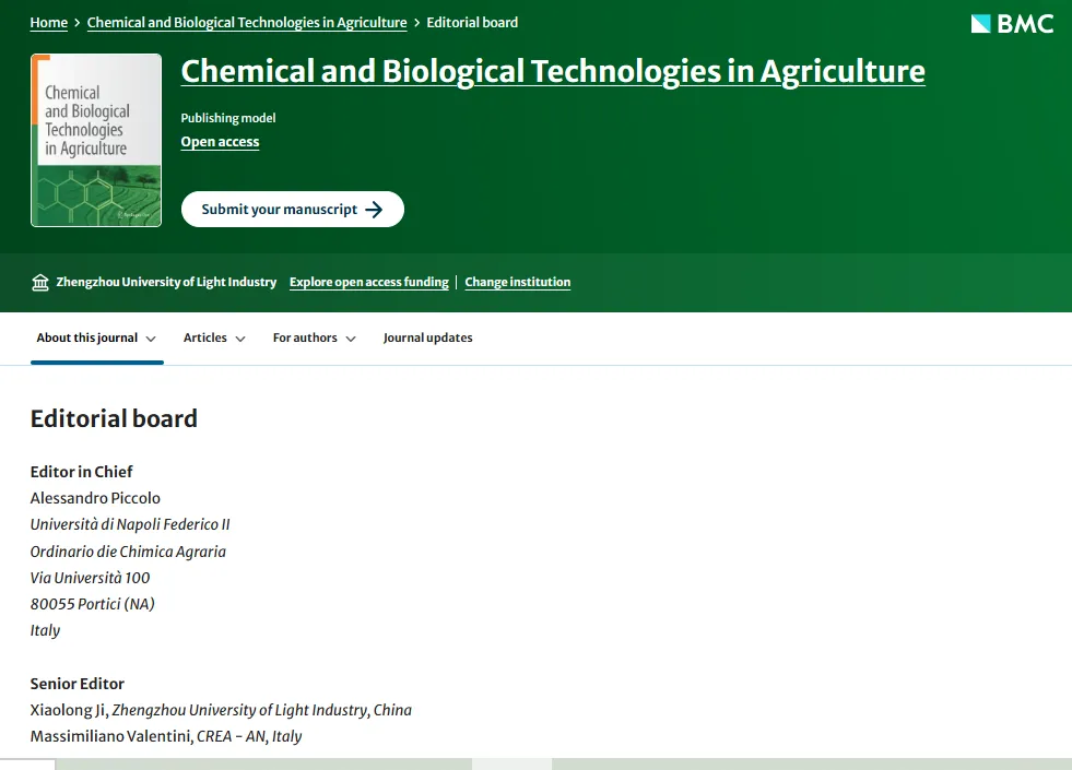 郑州轻工业大学冀晓龙副教授新任《Chemical and Biological Technologies in Agriculture》高级编辑