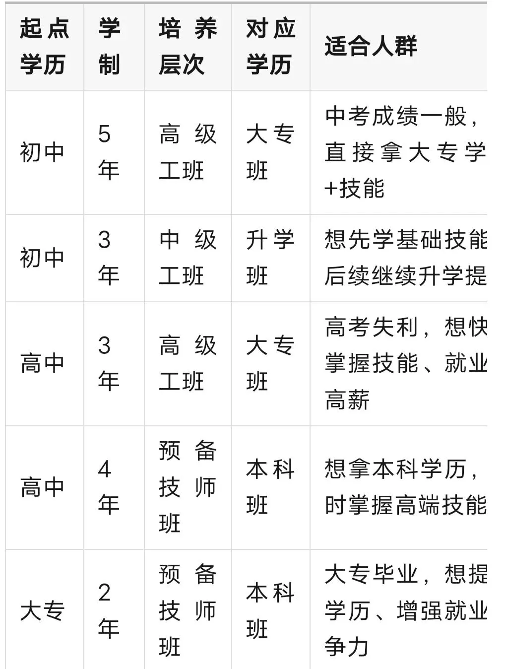 高级工班=大专层次,预备技师班=本科层次。技能、学历双丰收,未来发展更从容。