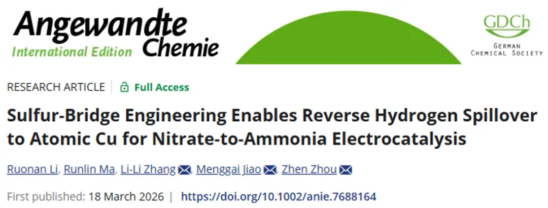 近日,郑州大学化工学院周震教授团队在电催化硝酸根还原合成氨领域取得突破性研究成果。针对传统铜基催化剂在高电流密度下易受亚硝酸盐积累和活性氢(*H)供应不足掣肘的难题,团队创新性地开发一种空心Co3S4多面体负载孤立铜单原子(Cu-Co3S4)的新型催化剂。该策略巧妙利用硫原子作为*H传输“桥梁”,实现了从Co3S4载体到Cu活性位点的反向氢溢流,显著加速了含氮中间体的加氢动力学。实验数据显示,优化后的Cu1.01wt%-Co3S4催化剂性能卓越,在−0.8 V电位下,氨产率高达94.52 mg h−1 mgcat.−1(18.90 mg h−1 cm−2),法拉第效率(FE)达到95.18%。并且,催化剂在−200 mA cm−2的工业级电流密度下,能够稳定连续运行300小时,组装应用于锌-硝酸根电池中也展现出优异的性能。相关成果以“Sulfur-Bridge Engineering Enables Reverse Hydrogen Spillover to Atomic Cu for Nitrate-to-Ammonia Electrocatalysis”为题,于2026年3月18日发表于Angewandte Chemie International Edition杂志上。