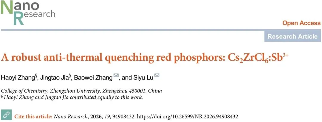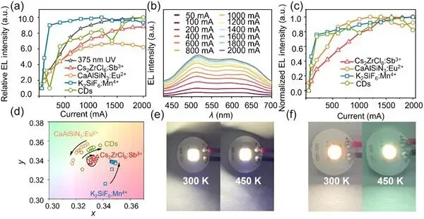 图2 (a) 掺杂量x=0.5%~4.6%的Cs₂ZrCl₆:3.3%Sb³⁺在280~500 K范围内的变温光致发光强度(以300 K下的发光强度为1进行归一化)。(b) 不同掺杂浓度(x=0.5%~4.6%)Cs₂ZrCl₆:xSb³⁺的热释光光谱。(c) 298~523 K一个加热–冷却循环中,Cs₂ZrCl₆:3.3%Sb³⁺与Cs₂ZrCl₆:5.1%Te⁴⁺的X射线衍射峰位置及其拟合斜率。(d) Cs₂ZrCl₆:3.3%Sb³⁺与Cs₂ZrCl₆:5.1%Te⁴⁺的热释光光谱。(e) 375 nm激发下Cs₂ZrCl₆:3.3%Sb³⁺的发射过程及能量补偿过程示意图。(f) 375 nm激发下Cs₂ZrCl₆:5.1%Te⁴⁺的发射过程及能量补偿过程示意图。图3 白光LED在高工作电流下的性能。(a) 在50–2000 mA高通量工作电流下,涂覆于紫外LED芯片上的Cs₂ZrCl₆:xSb³⁺(红线与三角)、商用红色荧光粉CaAlSiN₃:Eu²⁺(橙线与圆点)、商用抗热猝灭荧光粉K₂SiF₆:Mn⁴⁺(蓝线与方块)及碳点(绿线与五边形)的电致发光光谱。同时记录紫外LED芯片的电致发光强度作为参考(灰线与星形)。(b) 以Cs₂ZrCl₆:xSb³⁺为红色荧光粉、Rb₃InCl₆:xSb³⁺为绿色荧光粉的白光LED在50–2000 mA电流范围内的电致发光光谱。(c) 在50–2000 mA电流范围内,分别以Cs₂ZrCl₆:xSb³⁺(红线与三角)、商用红色荧光粉CaAlSiN₃:Eu²⁺(橙线与圆点)、商用抗热猝灭荧光粉K₂SiF₆:Mn⁴⁺(蓝线与方块)及碳点(绿线与五边形)作为红色荧光粉、并以Rb₃InCl₆:xSb³⁺作为绿色荧光粉的白光LED的归一化电致发光强度光谱。(d) 基于Cs₂ZrCl₆:xSb³⁺(三角)的CIE色度坐标,并与商用红色荧光粉CaAlSiN₃:Eu²⁺(圆点)、商用抗热猝灭荧光粉K₂SiF₆:Mn⁴⁺(方块)及碳点(五边形)对比。(e) 采用Cs₂ZrCl₆:xSb³⁺的白光LED照片,以及(f) 采用商用红色荧光粉CaAlSiN₃:Eu²⁺的白光LED分别在低电流(300 K,左侧)与高电流(450 K,右侧)下的照片。本研究合成了Cs₂ZrCl₆:xSb³⁺荧光粉,其表现出强抗热猝灭行为,在500 K时仍能保持室温(300 K)荧光强度的120%。异价掺杂在基质晶格中诱发了高浓度缺陷。通过缺陷向发光中心的热激活能量传递,非辐射发射损失得到补偿,从而实现强抗热猝灭。以该抗热猝灭金属卤化物作为红光(Cs₂ZrCl₆:xSb³⁺)和绿光(Rb₃InCl₆:xSb³⁺)发光组分,制备了高功率白光LED器件,即使在高达2000 mA的工作电流下仍能保持稳定的发光强度与色度。我们希望本研究能进一步推动新型抗热猝灭金属卤化物荧光粉的发现与拓展。https://doi.org/10.26599/NR.2026.94908432本公众号聚焦国内外发光材料前沿进展与动态,关注材料领域样品制备与表征、及理论计算。为致力于发光材料研发的工程师、教师与学生等相关科研工作者提供交流平台,助力科研成果传播与学术发展。所有资料均来源于网络,公众号仅提供交流平台,不为其版权负责,如有侵权,请及时联系修改或删除,如需投稿或其它事宜,请发送至qq邮箱:lummat26@qq.com。