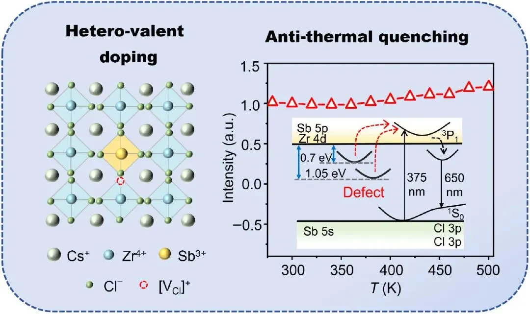 大多数荧光粉在高温下会因热激活非辐射跃迁而发生热猝灭(TQ)。热猝灭效应会导致荧光粉在高工作温度下发光效率显著降低,阻碍其在高功率荧光转换型白光发光二极管(WLED)中的应用。本文报道了一种零维金属卤化物钙钛矿:Cs₂ZrCl₆:Sb³⁺,其在高达500 K的温度下表现出强抗热猝灭红色发射,与主流抗热猝灭荧光粉(如K₂SiF₆:Mn⁴⁺)相当。Sb³⁺的异价掺杂诱发基质产生结构缺陷,从而在高温下通过缺陷向发光中心的热加速能量传递来补偿非辐射发射损失。我们将该红色抗热猝灭荧光粉组装成白光发光二极管(WLED)器件,在电流高达2000 mA时仍能实现稳定的输出光强度与色度。