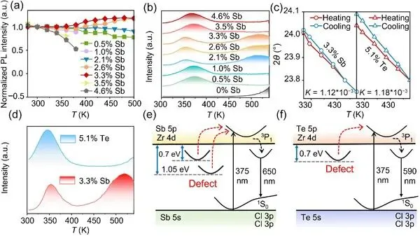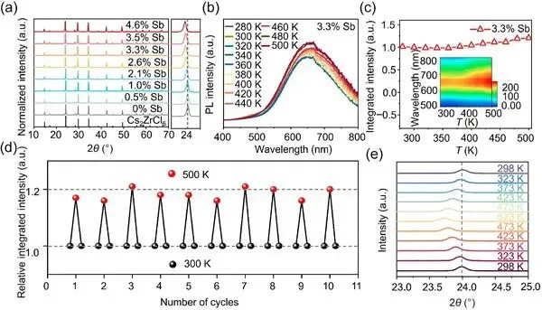图1 (a) Cs₂ZrCl₆:xSb³⁺(x = 0.5%、1.0%、2.1%、2.6%、3.3%、3.5%、4.6%)的粉末X射线衍射图谱。插图为24°处的衍射峰偏移。同时给出Cs₂ZrCl₆的标准X射线衍射图谱(ICSD No. 26695)作为参考。(b) 375 nm激发下,Cs₂ZrCl₆:xSb³⁺在不同温度(280–500 K)下的光致发光光谱。(c) Cs₂ZrCl₆:xSb³⁺的归一化变温光致发光光谱(以300 K下的光致发光强度为1进行归一化)。(d) Cs₂ZrCl₆:xSb³⁺从300 K到500 K的十次加热–冷却循环。分别在300 K(黑点)和500 K(红点)下记录光致发光强度(以300 K下的光致发光强度为1进行归一化)。(e) 一个加热–冷却循环中,Cs₂ZrCl₆:xSb³⁺在298到523 K范围内的变温X射线衍射图谱。