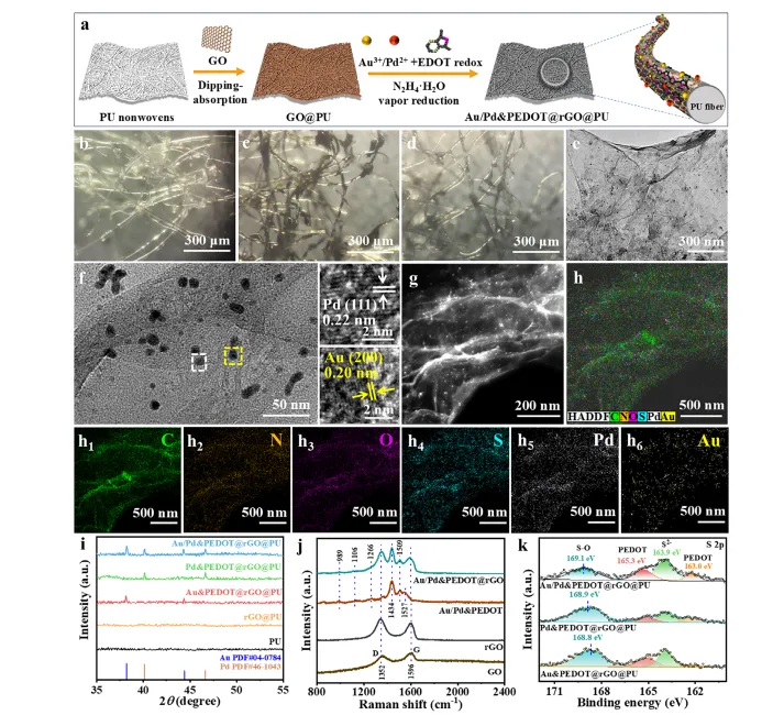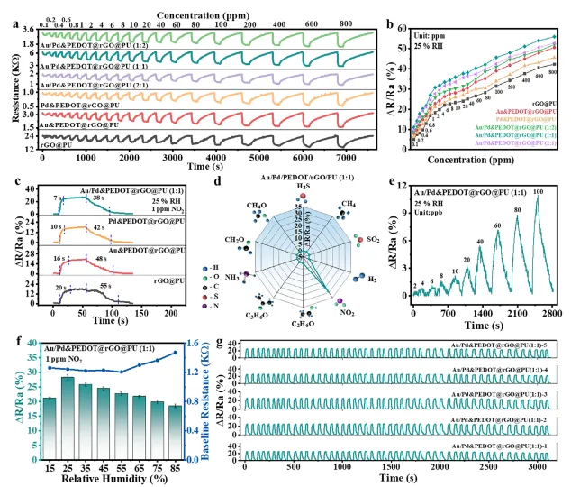 材料与制备工艺:传感器采用“PU无纺布基底+rGO导电框架+Au/Pd&PEDOT传感层”的层级结构;通过浸渍吸附法在PU表面负载GO,经原位氧化还原自组装形成Au/Pd&PEDOT复合层,最后经水合肼蒸汽还原GO为rGO;PU无纺布的三维多孔结构提供充足气体扩散通道,Au/Pd双金属纳米颗粒与PEDOT形成协同作用(论文1 2.1-2.3节);