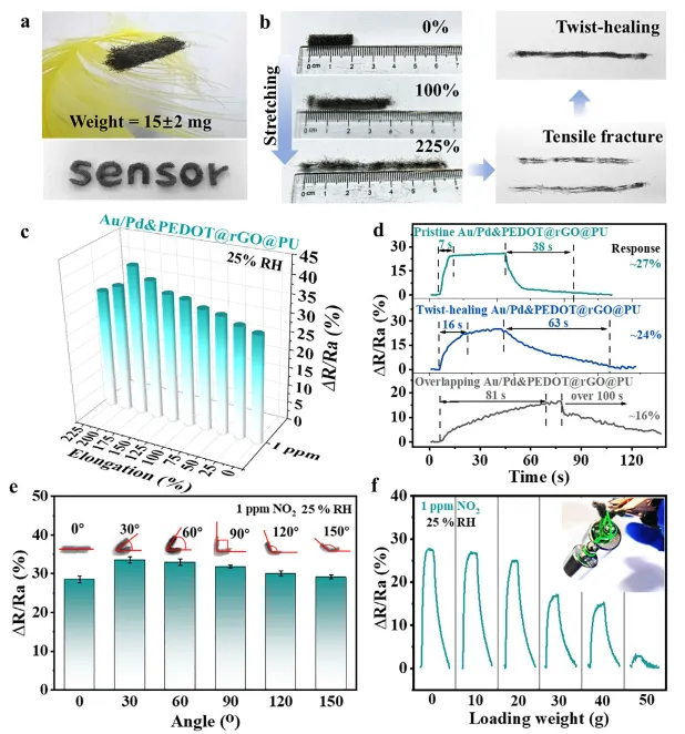 核心机制:PEDOT提供丰富传感位点,Au/Pd双金属纳米颗粒发挥催化作用加速气体吸附/脱附,rGO框架促进电荷快速转移,三者协同提升NO₂传感性能;PU基底的纤维缠绕特性与复合层的界面作用,赋予传感器扭曲自愈能力,断裂后可通过扭曲重构导电通路(论文1 Fig. 1a、3a;2.2-2.4节);
